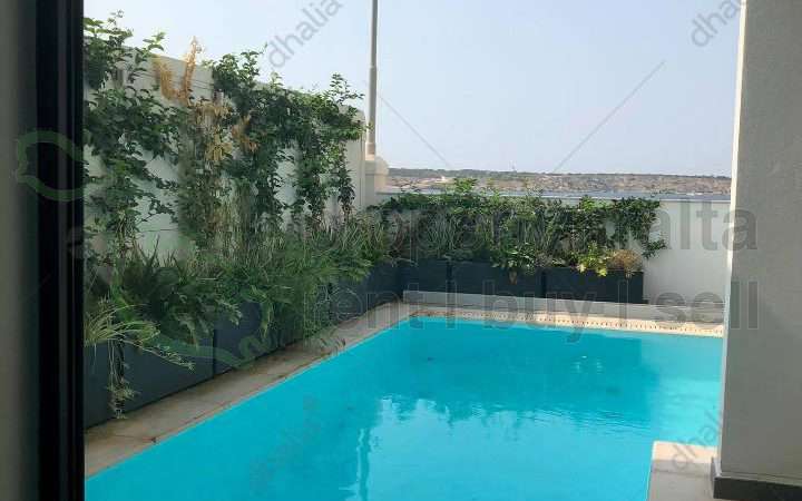 Perfectly positioned, seafront four-bedroom villa in Santa Maria Estate, Mellieha. This fully air-conditioned villa consists of an open-plan kitchen, equipped with a dishwasher/dining/living area leading to a front terrace with a beautiful heated swimming pool. Two bedrooms with an ensuite, a family bathroom, and an internal courtyard. The property is equipped with lots of modern luxuries such as underfloor heating, smart audio and blinds, walk-in wardrobes, and solar heating throughout. Must see!