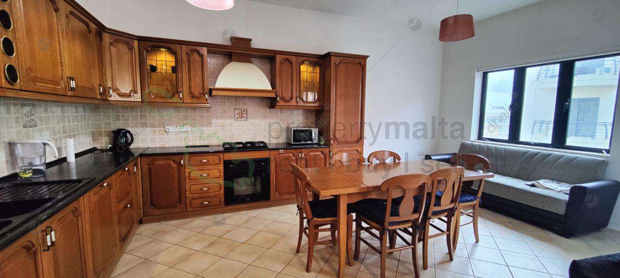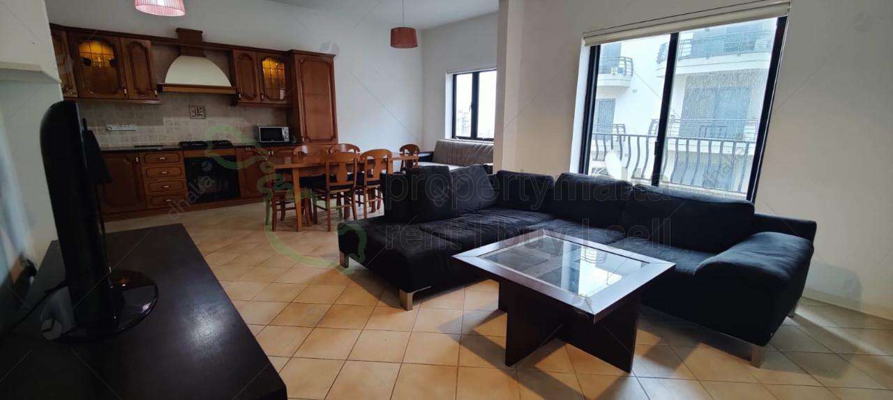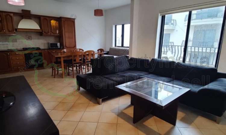 Three-bedroom apartment located close to St Thomas Bay, set on the second floor and served with lift. The property consists of an open-plan kitchen/living/dining area with a front balcony with sea views, a bathroom, three double bedrooms and an ensuite. A spiral staircase leads to the washroom and a private roof. Fully equipped with air-conditioning units installed. A one-car garage is also included in the price.
