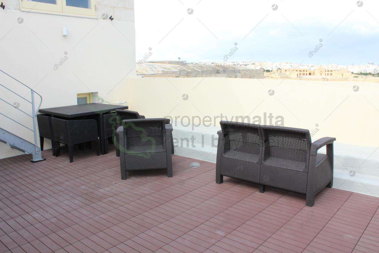 Brand new one bedroom duplex apartment set bang on the seafront. Entrance into a hall leading to a bedroom. Upstairs is the kitchen/living/dining with its own private terrace and recreational area enjoying views of the sea and Valletta`s spectacular rooftops and streets. Luxury furnished with all functional necessities and includes cleaner facilities twice a month.