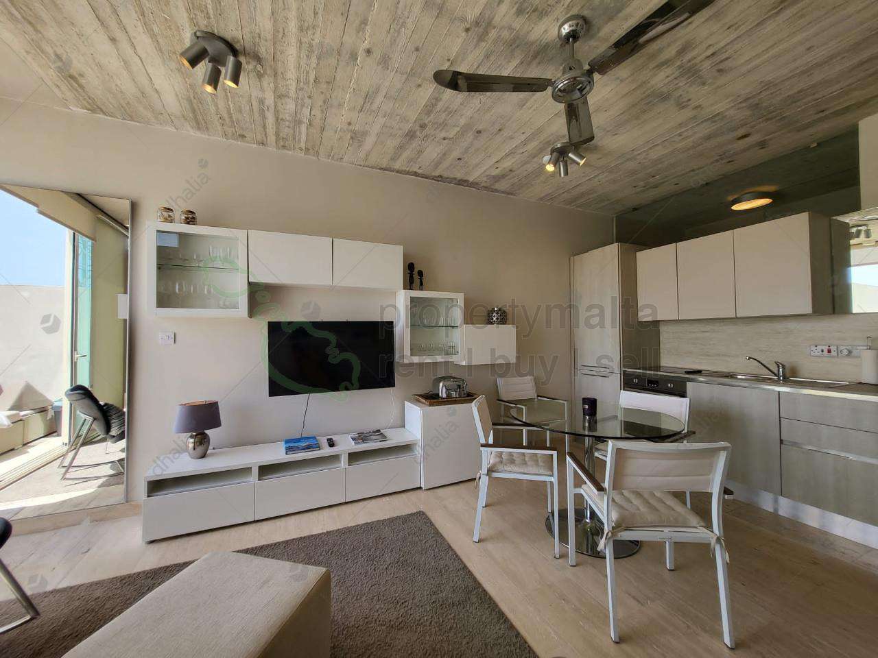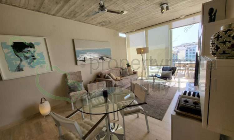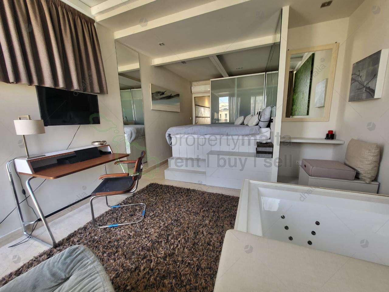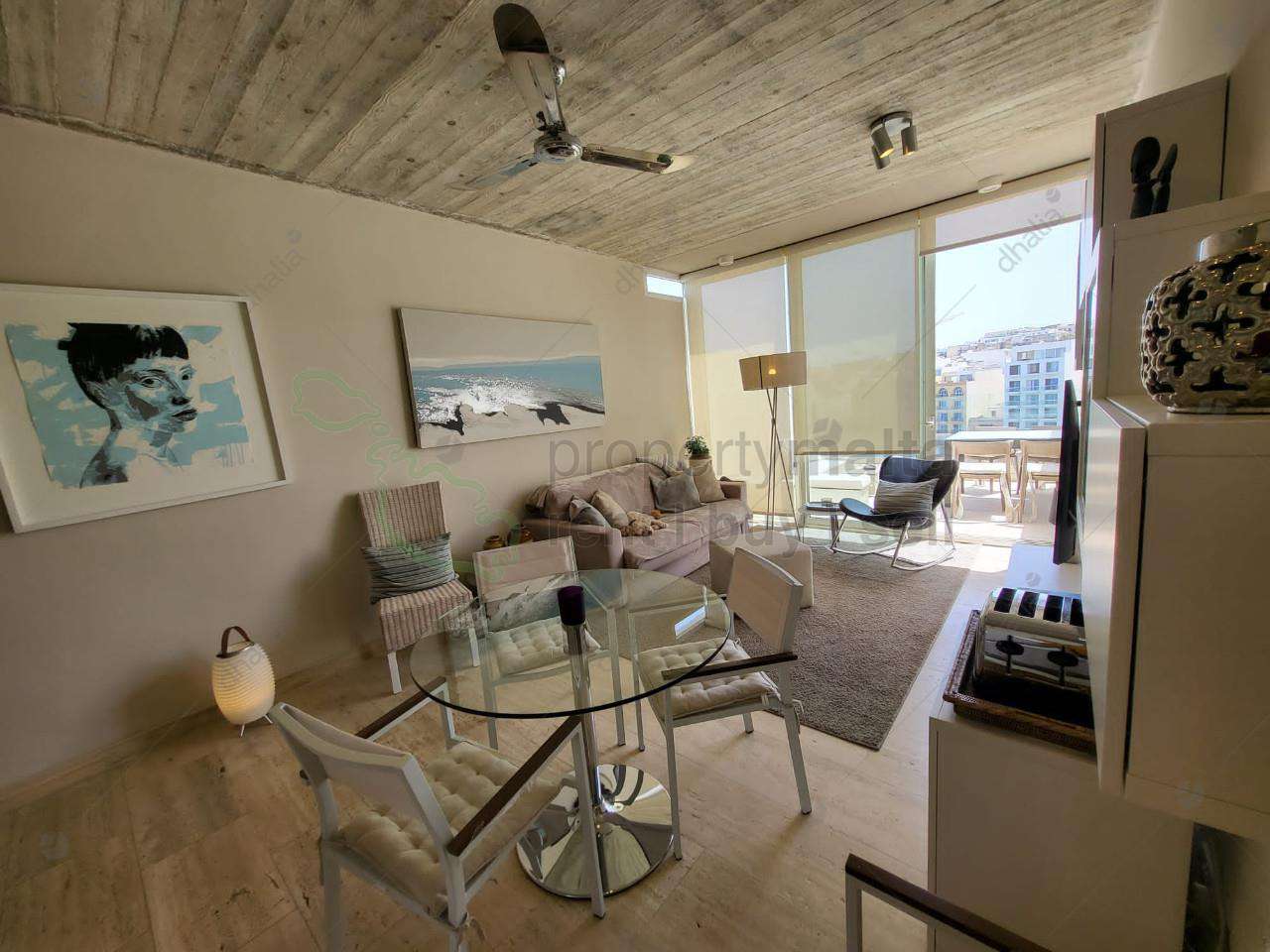 Duplex penthouse overlooking Spinola Bay. The first story consists of a kitchen and dining area, a spacious front terrace with dining and cooking equipment, one double bedroom enjoying a luxurious jacuzzi, the main bathroom, and a back balcony. On the second story, one finds an additional living area, a second terrace with further outdoor furniture, another double bedroom, and another bathroom.
