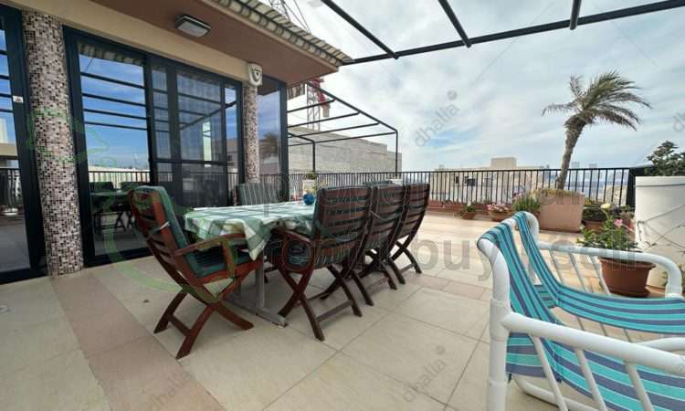One minute walk from the seafront comes this luxuriously furnished duplex and corner penthouse with ample external area for entertainment. Further complementing the property is it`s airspace which can be developed into another penthouse with the ability of the current two floors to be split into four rental units, making it five in all. The current layout is in the form of a very large open plan with a very spacious terrace on the top floor level and four bedrooms, four bathrooms and an entertainment area on the lower level. One car space is included in the price. The property is served with a lift and is freehold.