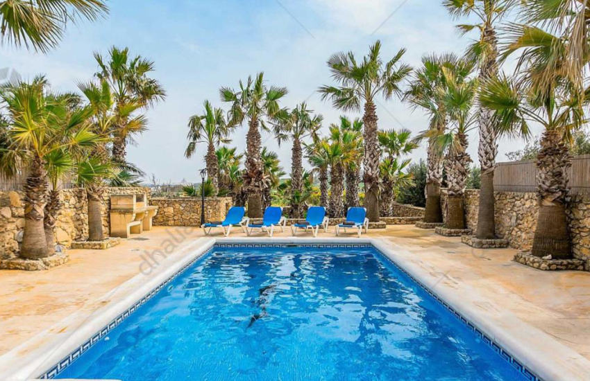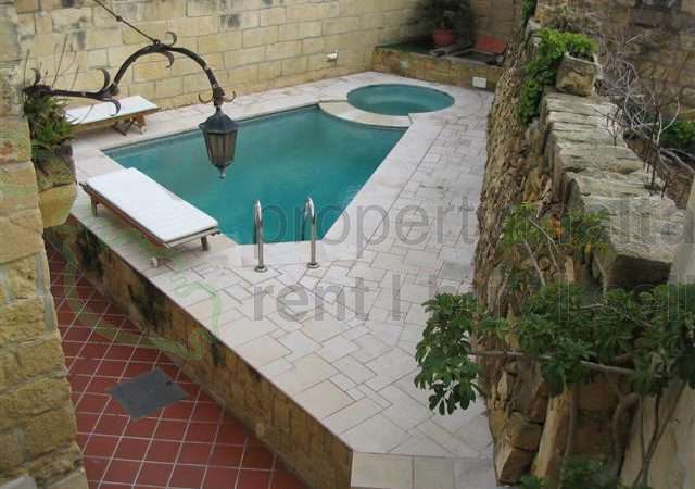 200 years exquisite and charming farmhouse kept in a wonderful condition and is located in the village of Xewkija. The ground floor comprises of a very large, fully equipped kitchen/dining and living room complete with television and pay phone. Two double bedrooms one with bathroom en-suite. The triangle shaped Pool measuring 16 feet by 10 feet and Jacuzzi and a lovely south facing yard with a gas fired barbecue. An external stone staircase leads to the first floor where you will find two more double bedrooms another large bathroom with an extra shower, and a very large sun bathing terrace. The property is completely furnished in very rare antique furniture and is equipped with TV, Jacuzzi, washing machine and can accommodate up to 8 persons. Available for short lets only.