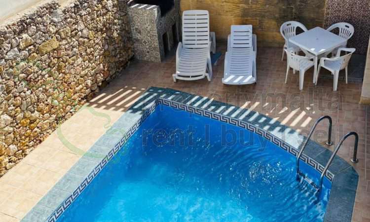 A lovely and cozy farmhouse situated in the beautiful village of Xaghra, close to a bus stop and mini market. Upon entrance one can find a small courtyard leading to a sitting area, fully equipped kitchen and dining room, a double bedroom with ensuite facility, a main bathroom are all found on the ground floor. The living area leads to the swimming pool and decking area. There is another bedroom, a bathroom and a good sized terrace on the first floor. Both bedrooms are equipped with air-conditions.