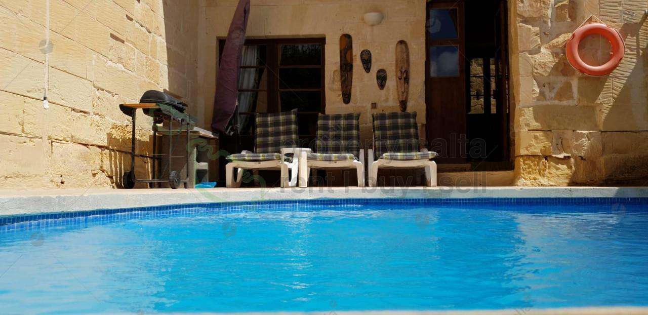This farmhouse is a traditional 300-year olf farmhouse in a quiet area in Xaghra close to the Gigantija temples consisting of three bedrooms all having ensuites, another private bathroom, a combined kitchen/living/dining leading to the pool area. All bedrooms are air-conditioned.
