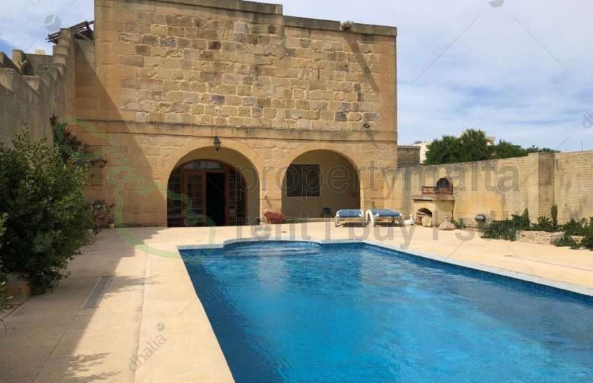 A lovely and cozy farmhouse situated in the beautiful village of Xaghra, close to a bus stop and mini market. Upon entrance one can find a small courtyard leading to a sitting area, fully equipped kitchen and dining room, a double bedroom with ensuite facility, a main bathroom are all found on the ground floor. The living area leads to the swimming pool and decking area. There is another bedroom, a bathroom and a good sized terrace on the first floor. Both bedrooms are equipped with air-conditions.