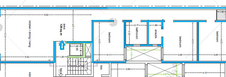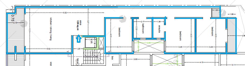 A three-bedroom apartment ready-built at third floor level. The layout comprises an open plan kitchen/living/dining leading to the front terrace, a main bathroom, a master bedroom with an ensuite, another two bedrooms, and a back balcony.