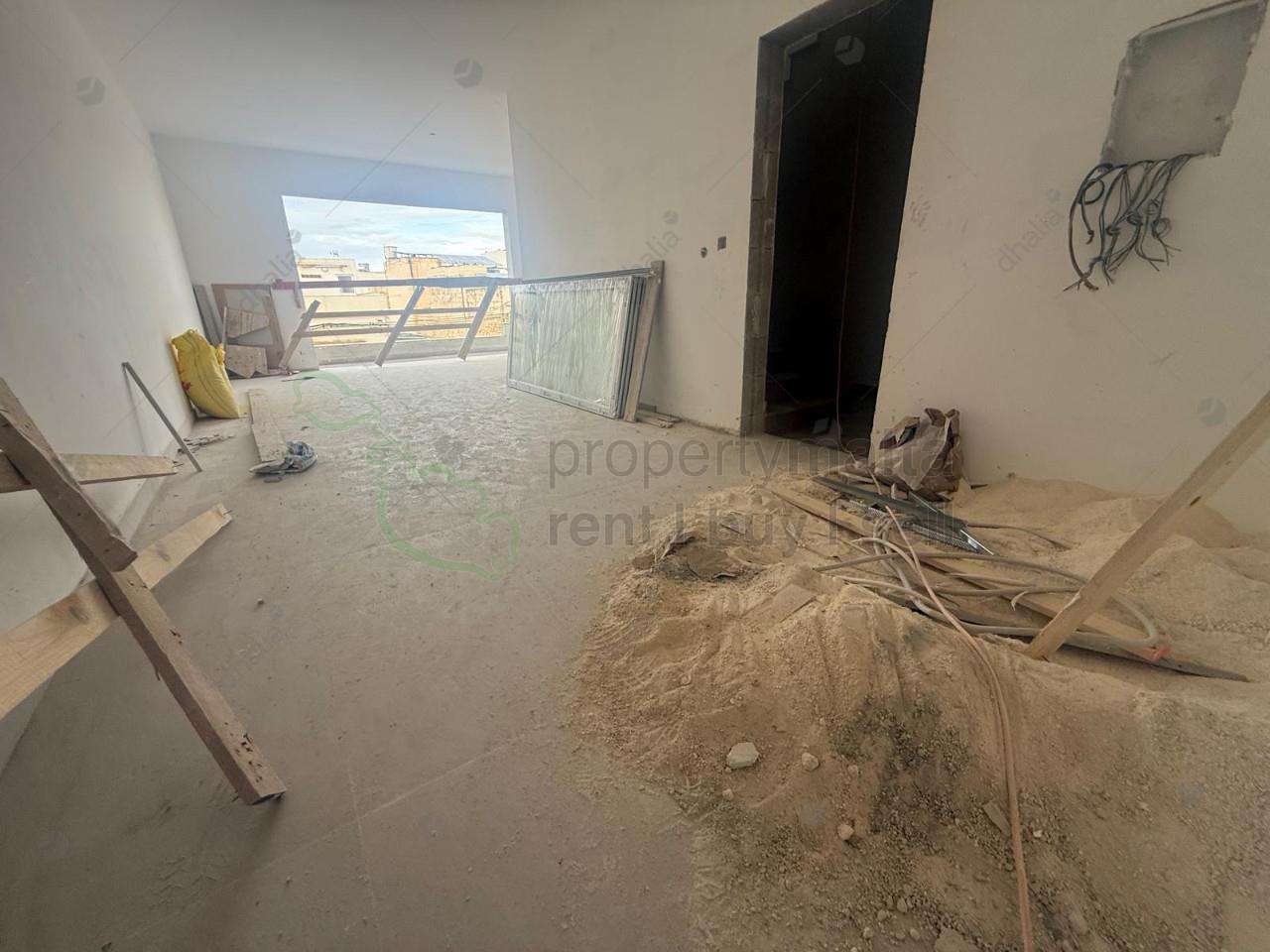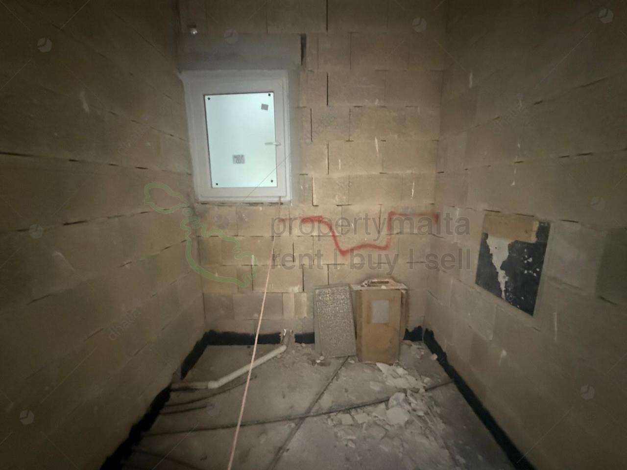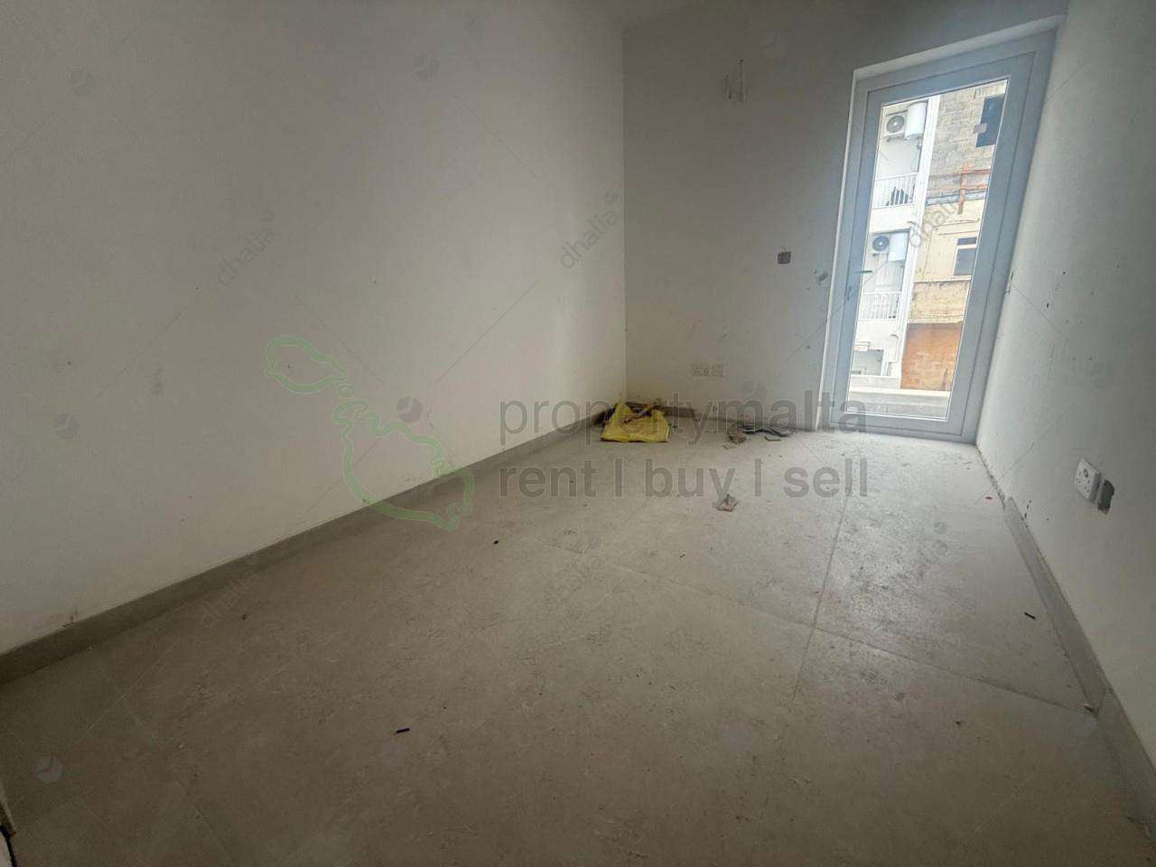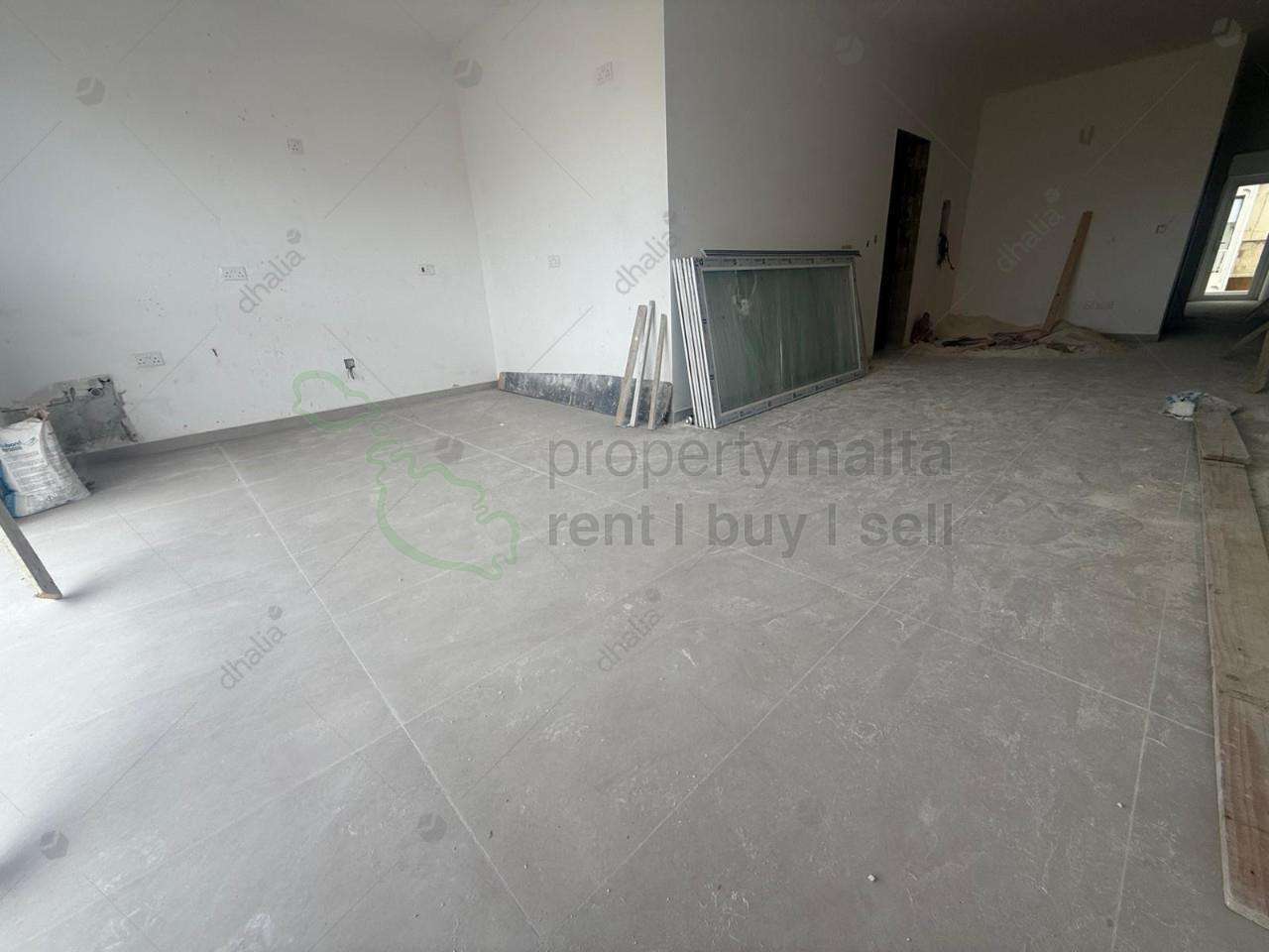 A finished, two-bedroom apartment on the second floor, located in Fgura. The layout features an open-plan kitchen, living, and dining area leading to a front balcony, a main bedroom with an ensuite shower, a second bedroom, and a back balcony.