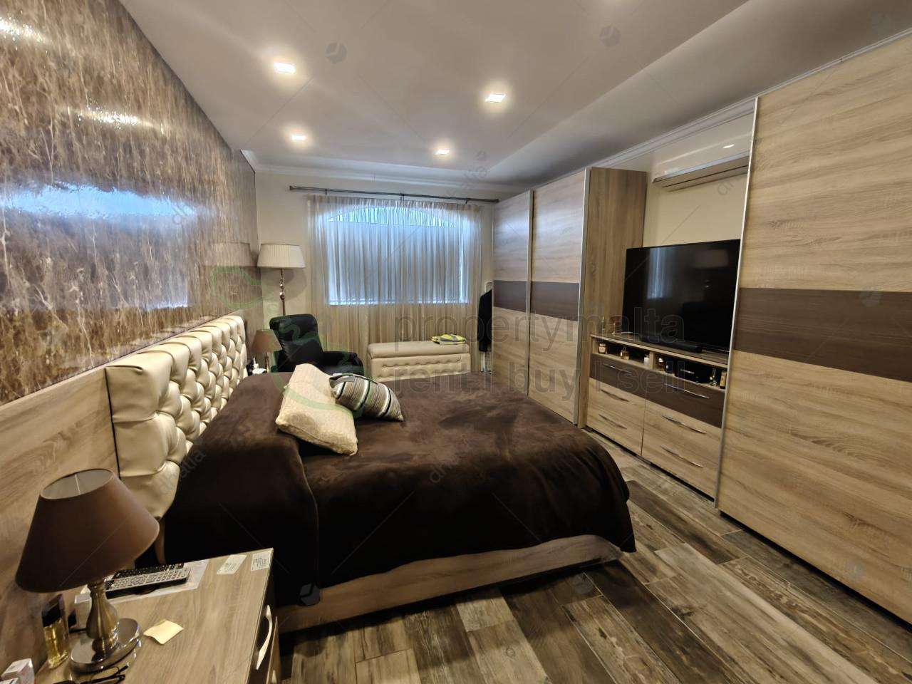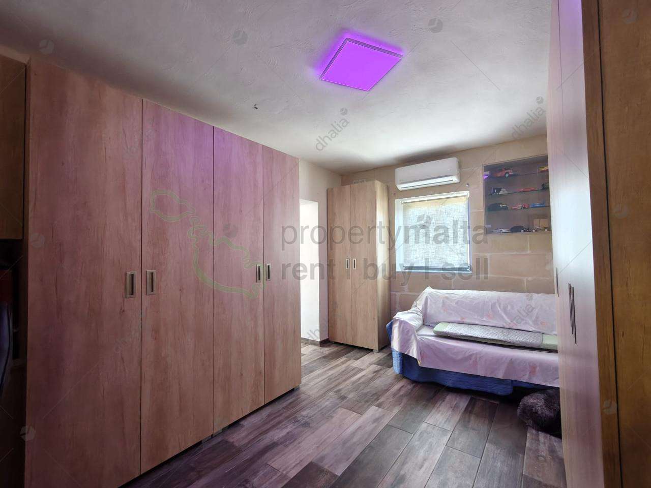 Modern corner two-bedroom apartment in the Hal Farrug area, featuring a squarish layout with an open-plan kitchen, living, and dining area, a double bedroom, a single bedroom, a bathroom, and a washroom. The property is freehold, comes partly furnished, and includes use of the roof. An optional one-car street-level garage is available at an extra cost. For more information, get in touch.