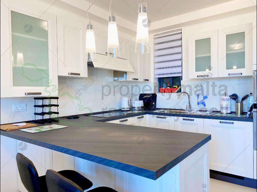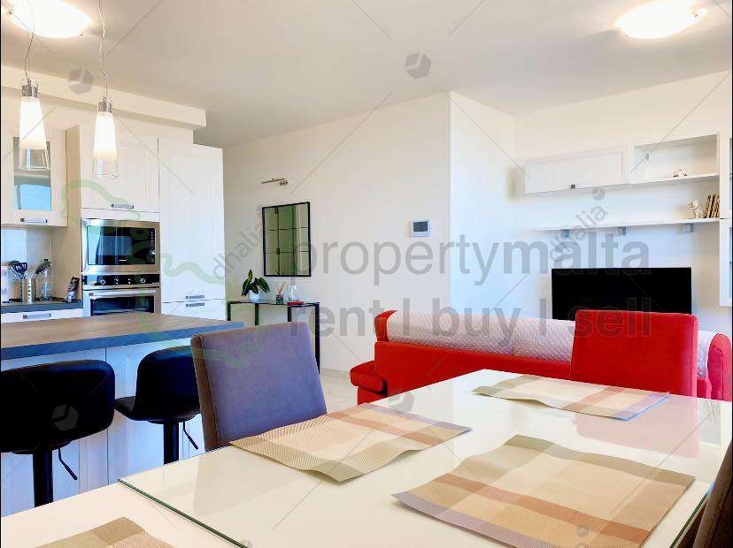 A modern, bright, and spacious enjoying beautiful distant sea views and spacious two-bedroom apartment in Mellieha. The apartment consists of an open-plan living/dining area, a kitchen (equipped with a dishwasher), two double bedrooms, an ensuite, a family bathroom, a box room, a front balcony, and another balcony at the back leading off from the two-bedrooms. Complementing this property is a one-car lock-up garage.