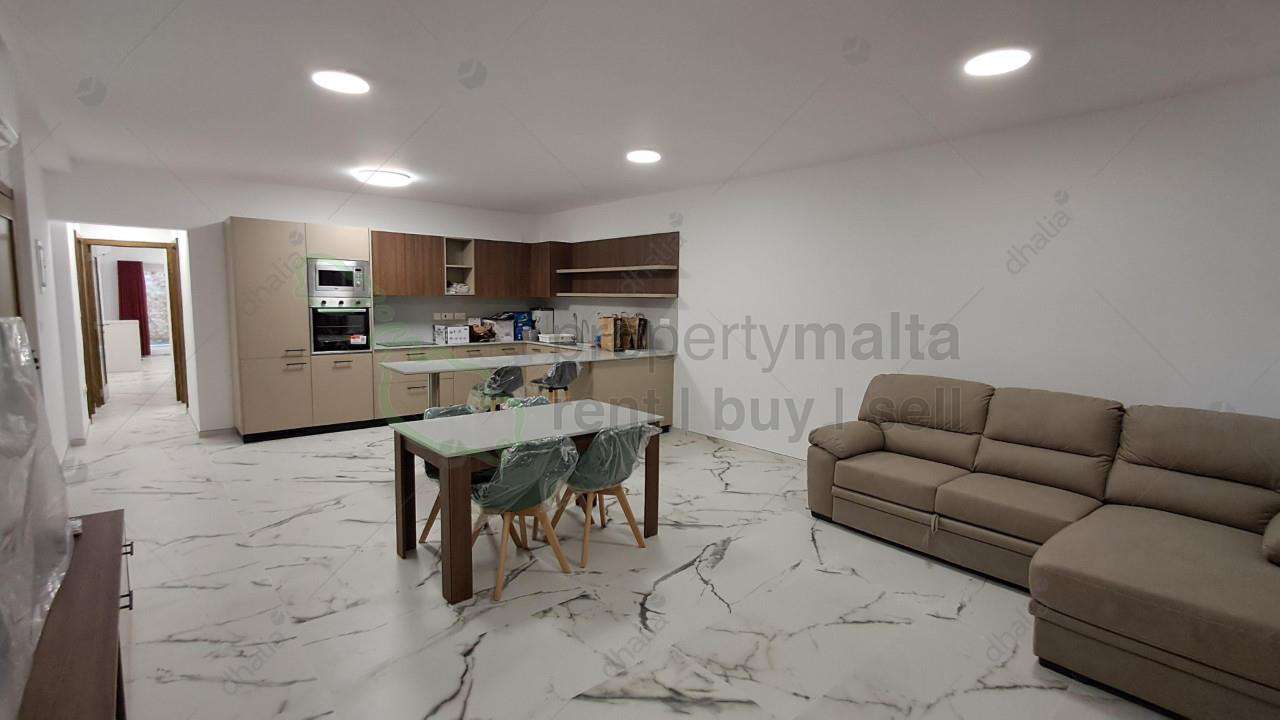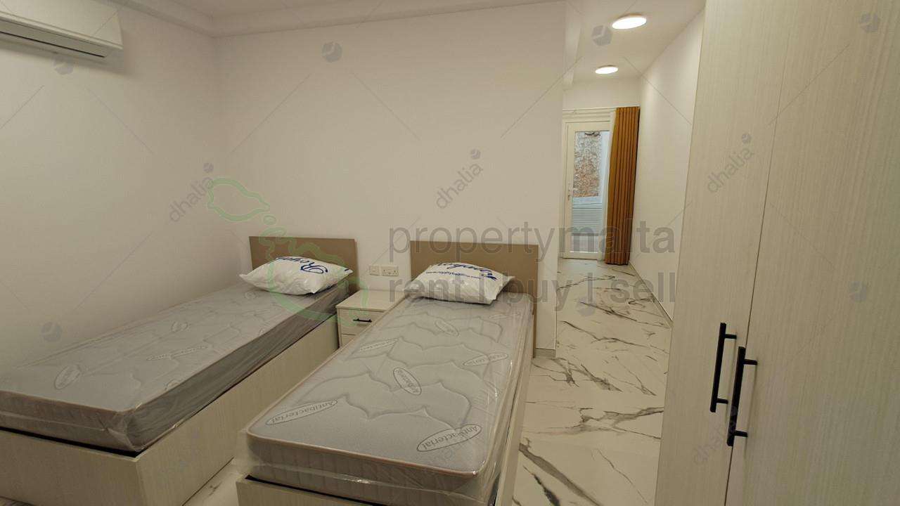 A spacious ground-floor apartment set within a small block, featuring an open-plan kitchen, dining, and living area upon entrance, one double bedroom, a second bedroom with two single beds and an ensuite shower, both bedrooms opening onto a backyard, and a main shower room. This brand-new property is ideally located close to all amenities.