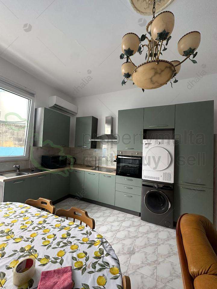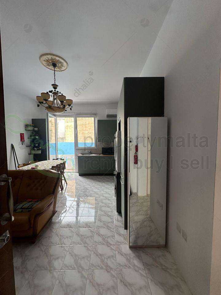 A modern and cozy apartment located in the heart of Mosta, featuring a spacious open-plan kitchen, living, and dining area. The living space is fully equipped with a TV, washing machine, dryer, and air conditioning, and opens onto a private balcony with a laundry drying rack.