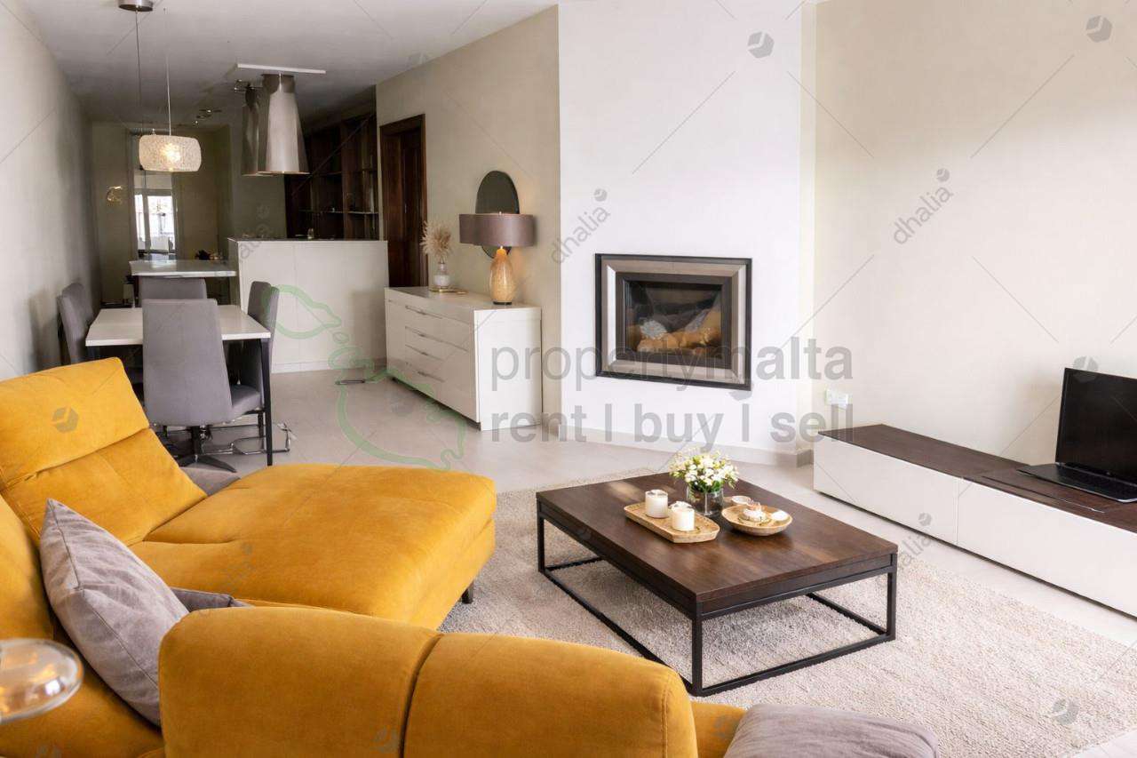Mosta Outskirts – Furnished Apartment, enjoying a fitted kitchen/living/dining leading to a front terrace, a wide corridor (space for an open study), a main bathroom, a main bedroom with an ensuite, a second bedroom with a back balcony, and a laundry room. An optional one-car garage is also available.