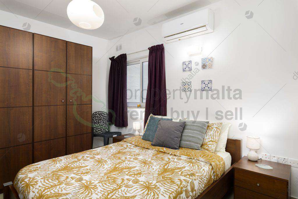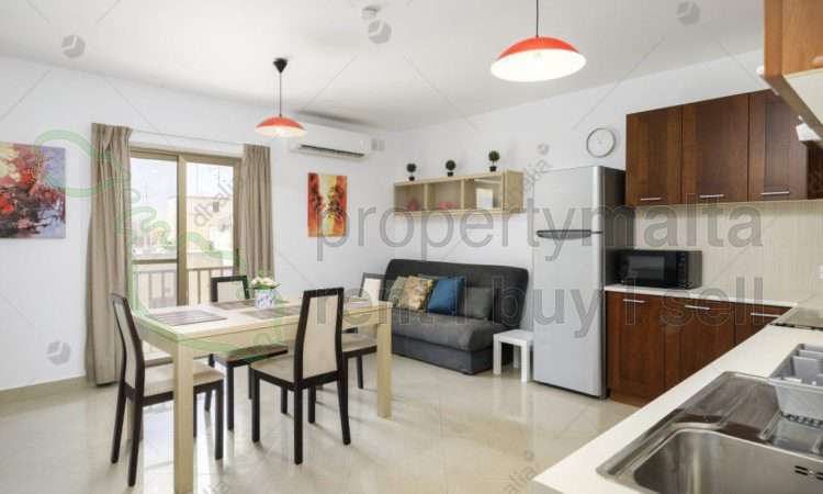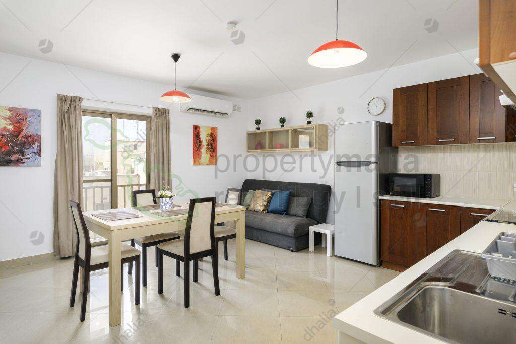 Spacious, bright, and airy, one-bedroom apartment, fully airconditioned, with the main bathroom, open plan kitchen, dining, and living area with front balcony. Close to the center of Bugibba / Qawra and all amenities.
