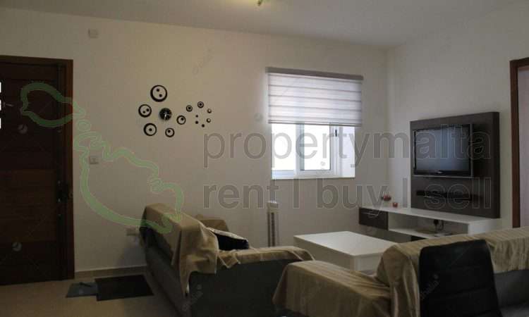 Bright and spacious three-bedroom apartment in a smart block in Qawra. The property comprises an open-plan kitchen/living/dining area, a bathroom, and three double bedrooms, and a front balcony.