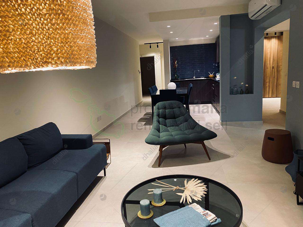 A three-bedroom apartment has an open-plan kitchen/living/dining room leading to a front balcony, three double bedrooms, a guest toilet, and a boxroom.