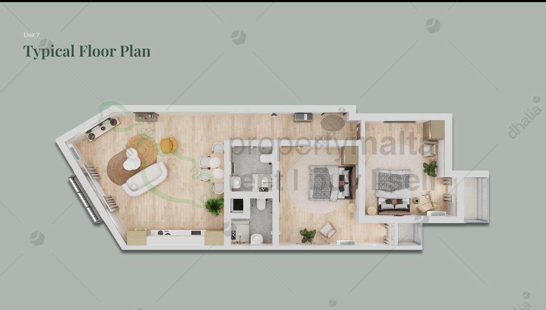 New block coming up next to Lidl San Gwann. Open plan kitchen /living /dining complemented with a balcony and a bathroom, two bedrooms, main with ensuite and both bedrooms enjoys a small balcony. Property is being sold on plan finished excluding bathroom and internal doors. Excavation started and estimated to be finished beginning of 2026. Close to all amenies. Contact Agent for more info. Optional 1 car garage at €48,000