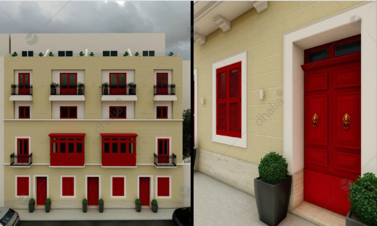 Santa Venera, second-floor, two-bedroom apartment. Layout consists of an open-plan kitchen/living/dining area, box room, two bedrooms main with ensuite shower, main bathroom, and back balcony.