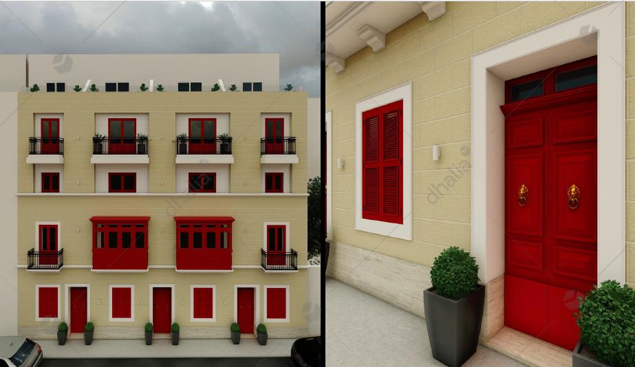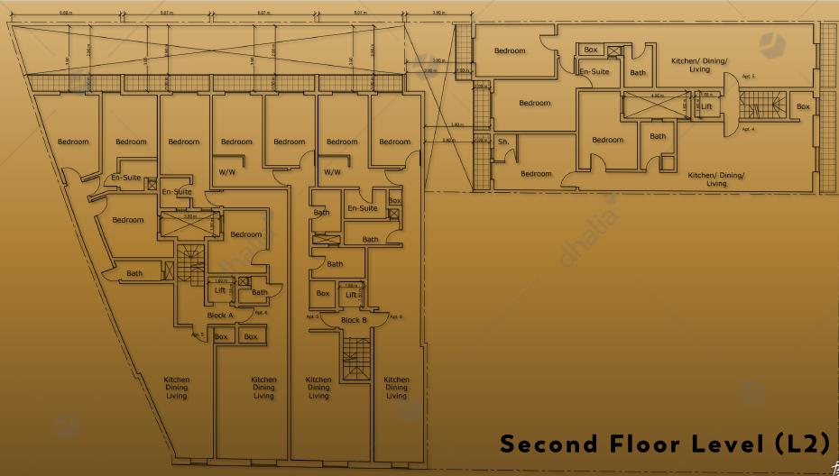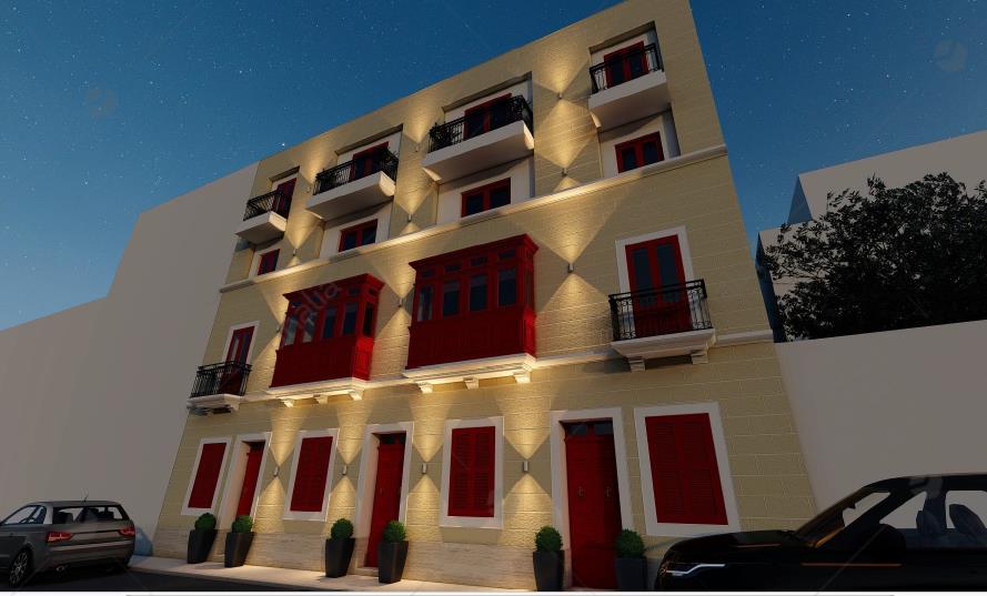 Santa Venera, second-floor, two-bedroom apartment. Layout consists of an open-plan kitchen/living/dining area, box room, two bedrooms main with ensuite shower, main bathroom, and back balcony.