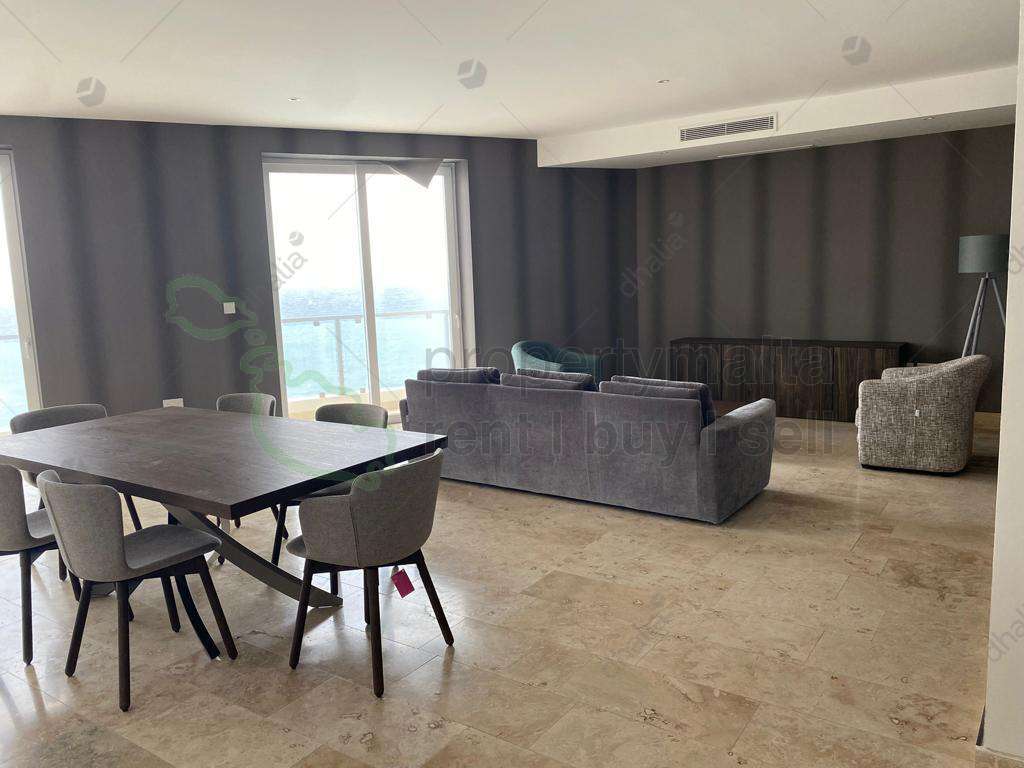 The seventh-floor apartment on the seafront has a very large facade situated close to the shopping area. Property is in the form of a squarish layout, a large entrance hall, large lounge/dining room onto a balcony boasting breathtaking sea views, separate kitchen, three bedrooms all having ensuite, two of the bedrooms have back terraces, main bathroom, boxroom and laundry room. Ready for immediate occupation.