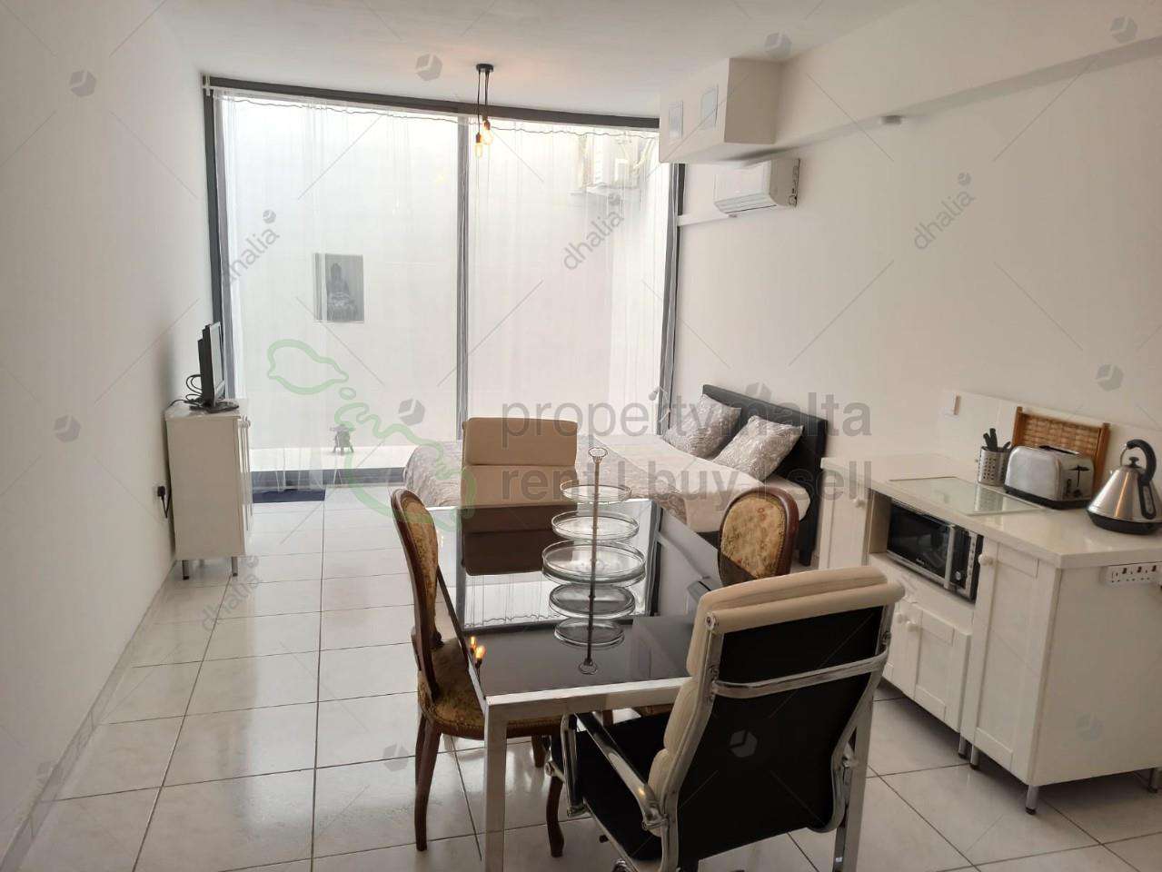 A studio street level with own entrance, five minutes away from Balluta. Fully AC, fully equipped, with electric hob and oven, microwave, instant hot water in shower and kitchen with automatic washing machine. The price is inclusive of water, electricity and internet.