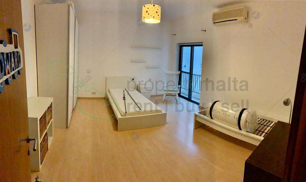 Impeccably kept, designer finished and furnished third floor 185 square-metre apartment situated in a quiet residential area and in a cul-de-sac in the upper parts of St Julians. This lovely modern accommodation consists of a fully equipped and functional kitchen/breakfast room with a gas fireplace leading onto a large open plan sitting/dining room, with a good-sized front terrace ideal for entertaining and al fresco dining enjoying partial sea views. Plenty of natural light floods through this fabulous property. Three double bedrooms are currently set up as two double bedrooms, one twin, and a study that can be converted into a fourth single bedroom: two bathrooms (one ensuite and guest bathroom with jacuzzi bath) laundry room. The property comes fully equipped and air-conditioned. Optional two-car spaces are also available.