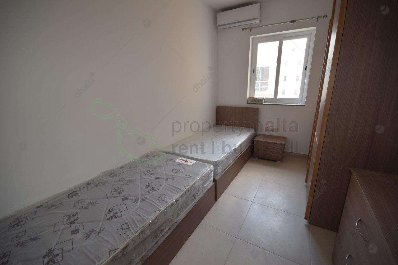 A brand new apartment in the heart of St Julians, close to all the main shops and amenities, featuring a large living area with fitted kitchen and appliances, 2 bedrooms both furnished with single beds, the larger having an en-suite and a main bathrooom with washing machine and tumble drier
