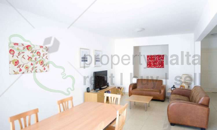 Bright, spacious and airy, first-floor apartment served with lift, situated in St Julian`s. Property consists of an entrance hall leading to a large sitting/dining/kitchen area with a small balcony, three spacious double bedrooms, a main bathroom, ensuite shower room, study area, back balcony and also use of roof enjoying sea views. An optional two-car lock-up garage is available. Apartment is fully equipped and air conditioned.
