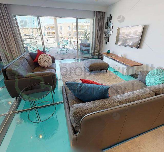 Highly finished apartment in one of Malta`s finest developments Portomaso Laguna, St Julians. This property comprises a large open-plan fully equipped kitchen/living/dining area, on top of the laguna having glass floor and boasting lovely views of the Marina, a laundry room with washing machine and tumble dryer, a guest bathroom, and two double bedrooms, both with ensuite facility. Property is fully furnished and equipped includes a car space and use of communal Laguna pool. A truly exceptional property!