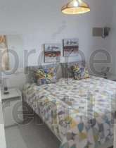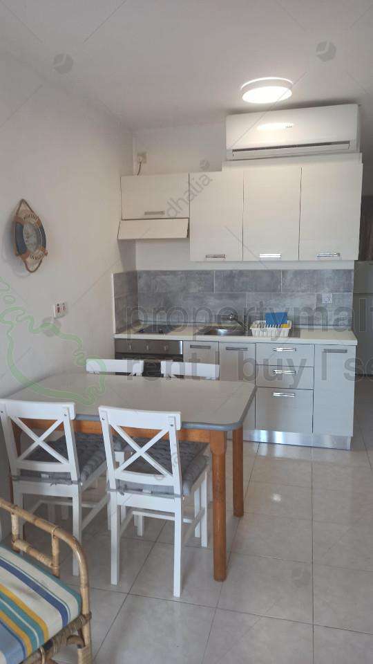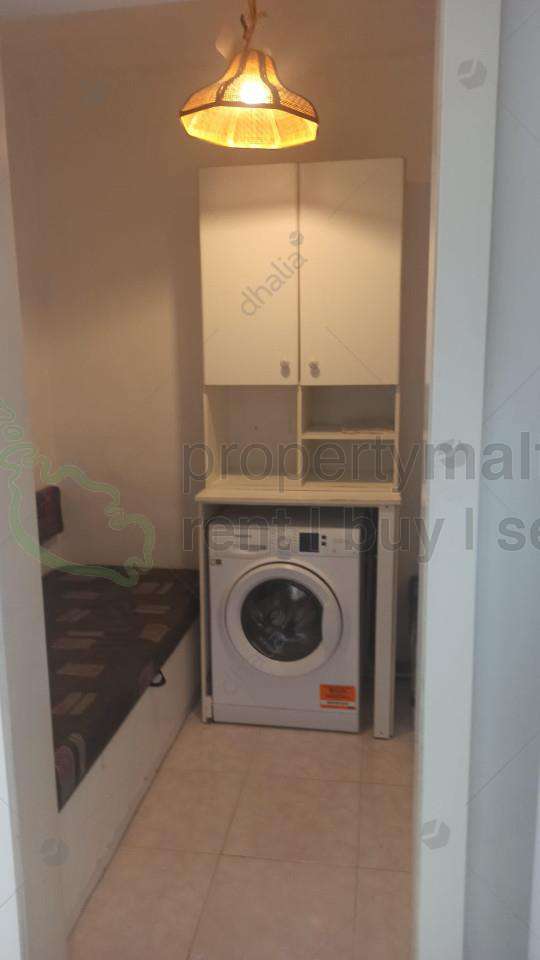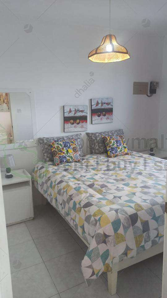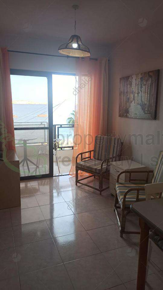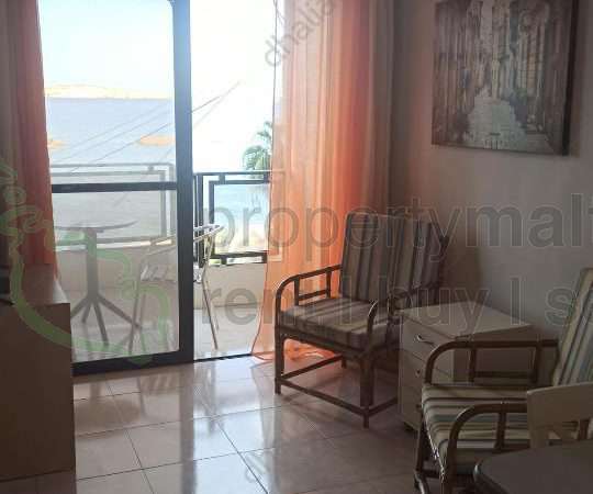 A furnished seafront two-bedroom apartment featuring an open-plan kitchen, living, and dining area equipped with a television and washing machine, complemented by a front balcony offering open sea views of St. Paul’s Islands, ideal for comfortable coastal living.
