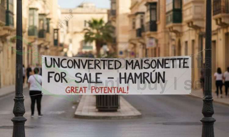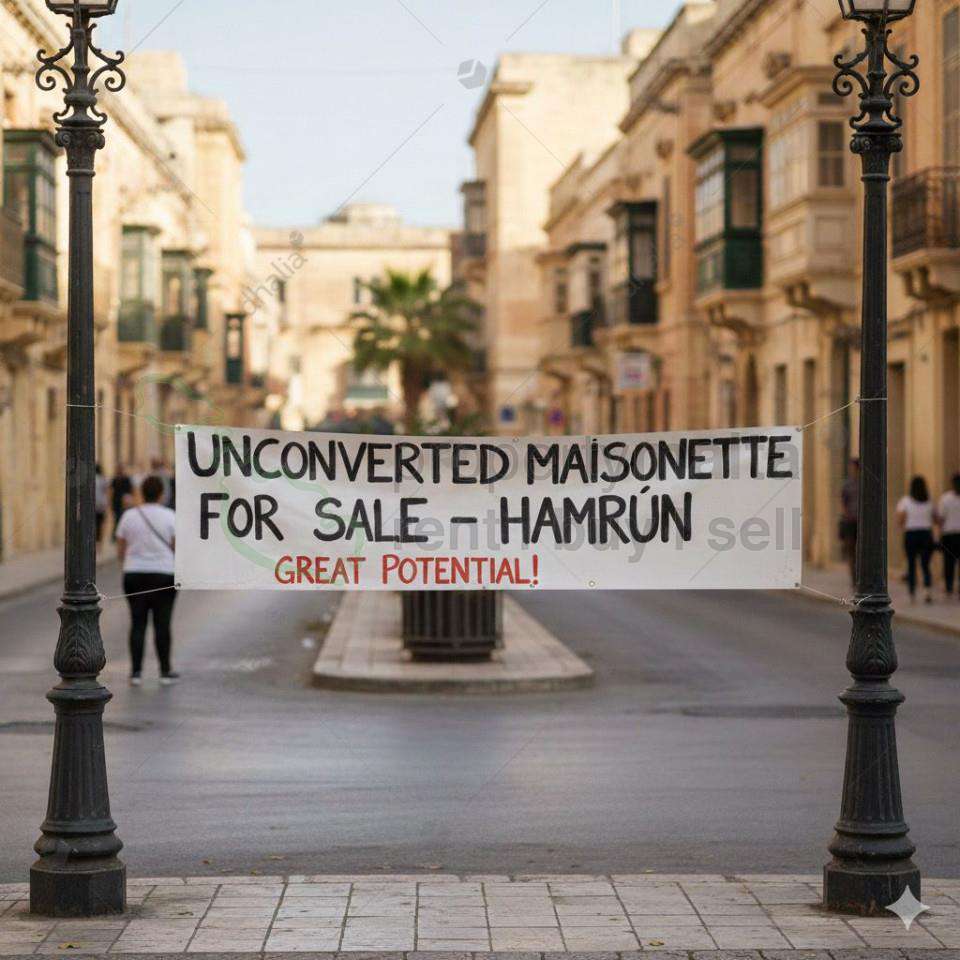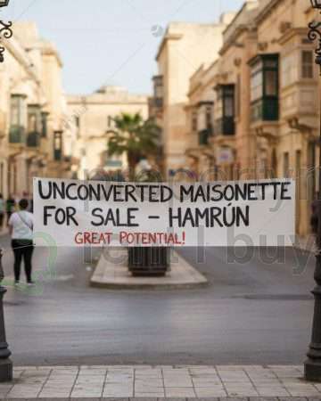 Hamrun, unconverted maisonette with permits in hand. The layout consists of an open-plan kitchen/living/dining area, three bedrooms, and three bathrooms.