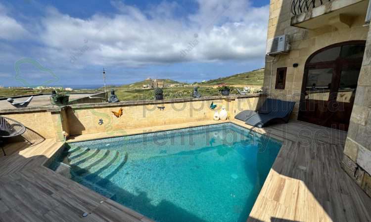 Tucked away in the charming village of Gharb, this exceptional house of character masterfully blends timeless Gozitan architecture with contemporary luxury. Every detail has been thoughtfully designed to offer comfort, style, and a sense of serene island living. On the ground level, you’ll find a beautifully appointed kitchen, a separate, cozy living area perfect for entertaining or relaxing, and a guest bathroom for added convenience. Step outside to your private haven — a spacious decking area and a pristine swimming pool invite you to unwind under the Mediterranean sun. The first floor features two generously sized double bedrooms, both with elegant en-suite bathrooms. One of the bedrooms also boasts a walk-in wardrobe, adding a touch of everyday indulgence. The top floor offers a unique and versatile space — currently serving as a stylish bar and living area, this third bedroom comes with its own en-suite and two stunning roof terraces. One of the terraces enjoys breathtaking ODZ views of the iconic Ta’ Pinu Basilica and includes a luxurious Jacuzzi, creating the perfect setting for unforgettable evenings. Adding to the practicality of this property is a basement level that houses a pump room and ample storage space. Whether you’re seeking a sophisticated residence or an upscale holiday retreat, this home captures the essence of Gozo’s charm with modern refinement. Viewings are highly recommended to fully appreciate this rare gem.
