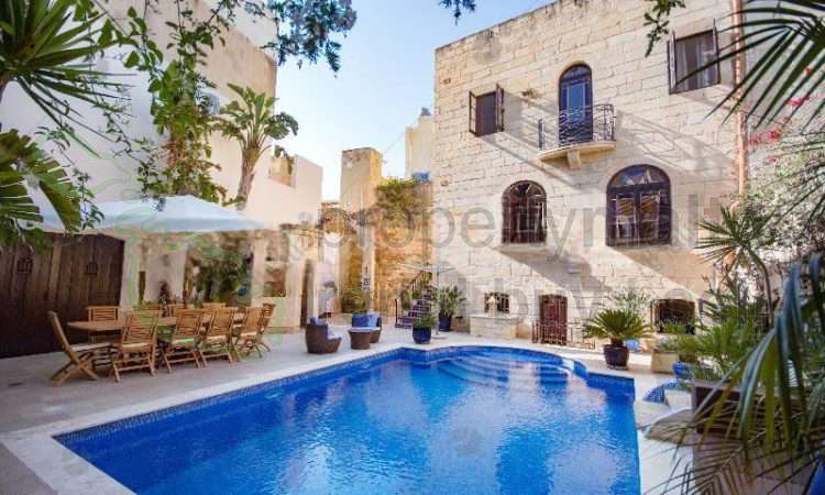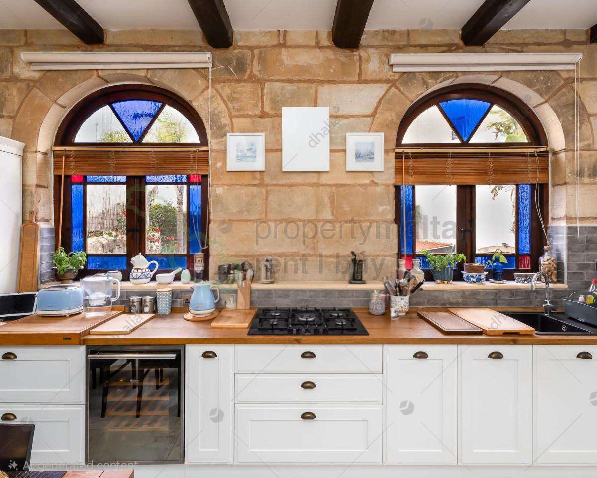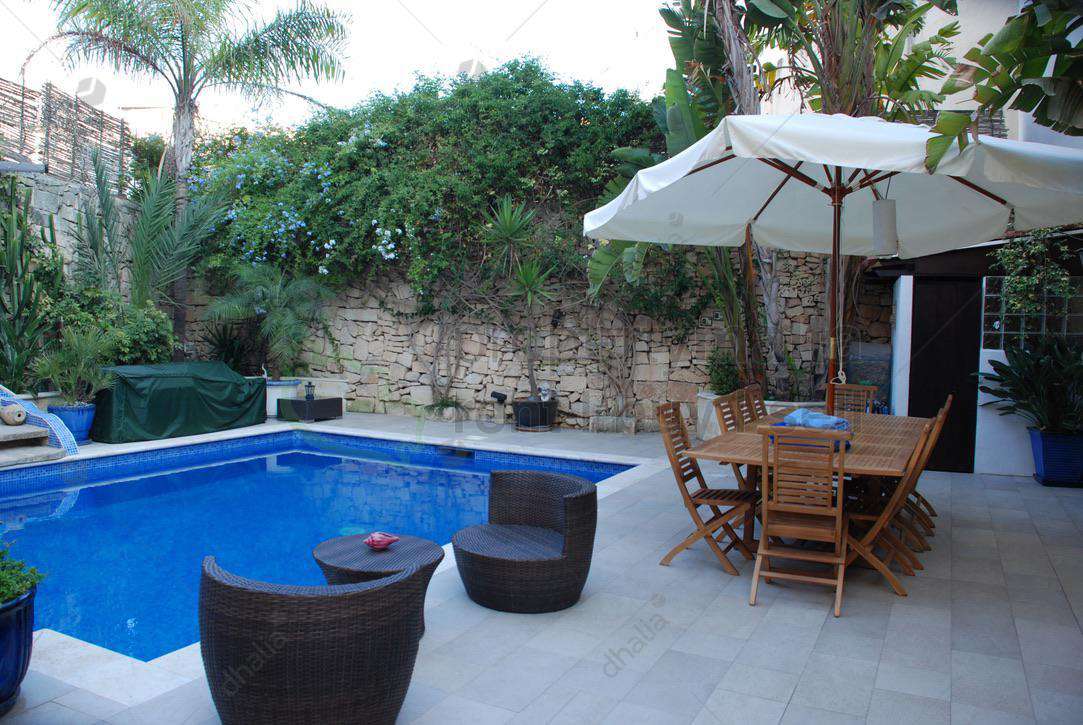 Situated close to the main church with all amenities at your doorstep this character house enjoys a private landscaped garden with pool and a two-car garage. The property has been recently refurbished, including its bathrooms and kitchen and is ready to move into. The layout flows at the minute you open the door, with a hall leading to a living room and dining area, then a large open kitchen, dining area overlooking the outside. At the pool level is another living room which is interconnected ideal for Summer entertaining. Upstairs are three double bedrooms,walk in wardrobe,a bathroom ensuite and one large bathroom. Enjoying lots of character and features as well as a practical layout this property portrays a very tranquil aura since it is set back from all roads and benefits easy living.