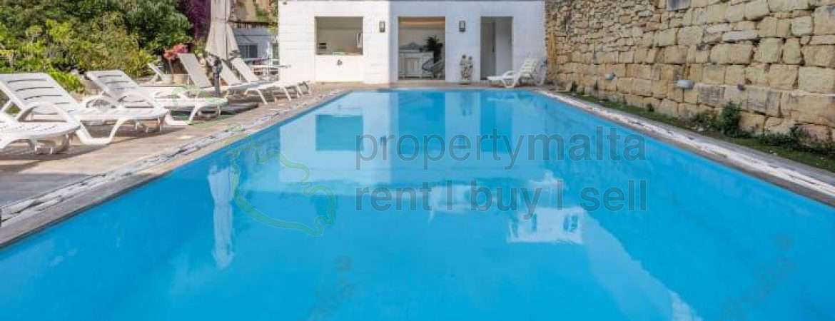 Large, fully converted House of Character situated on a quiet cobbled street, yet within walking distance from some of the best restaurants and entertainment Malta has to offer. The property has been restored with integrity and features modern electrical, plumbing, and climate systems. The layout comprises of ten bedrooms, all with en suite bathrooms, large fully fitted kitchen /dinning, separate study, and entertainment formal area. Complementing this lovely property are two spacious separate garden areas – one with a large pool with a summer house, the other is a chill out area. There are two separate car garages, and a carport for five cars leading onto a different road. This property also enjoys beautiful sea views from the roof level.