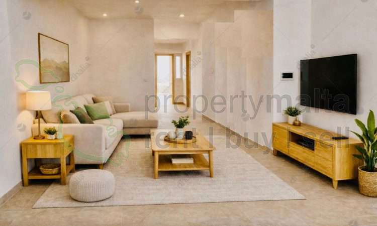 Sliema, close to Exiles, ground-floor one-bedroom maisonette. The layout offers an open plan kitchen/living/dining area, box room, main bathroom and the bedroom. The development is situated in an urban conservation area (no tax). The apartment is being sold finished, including bathrooms and doors.