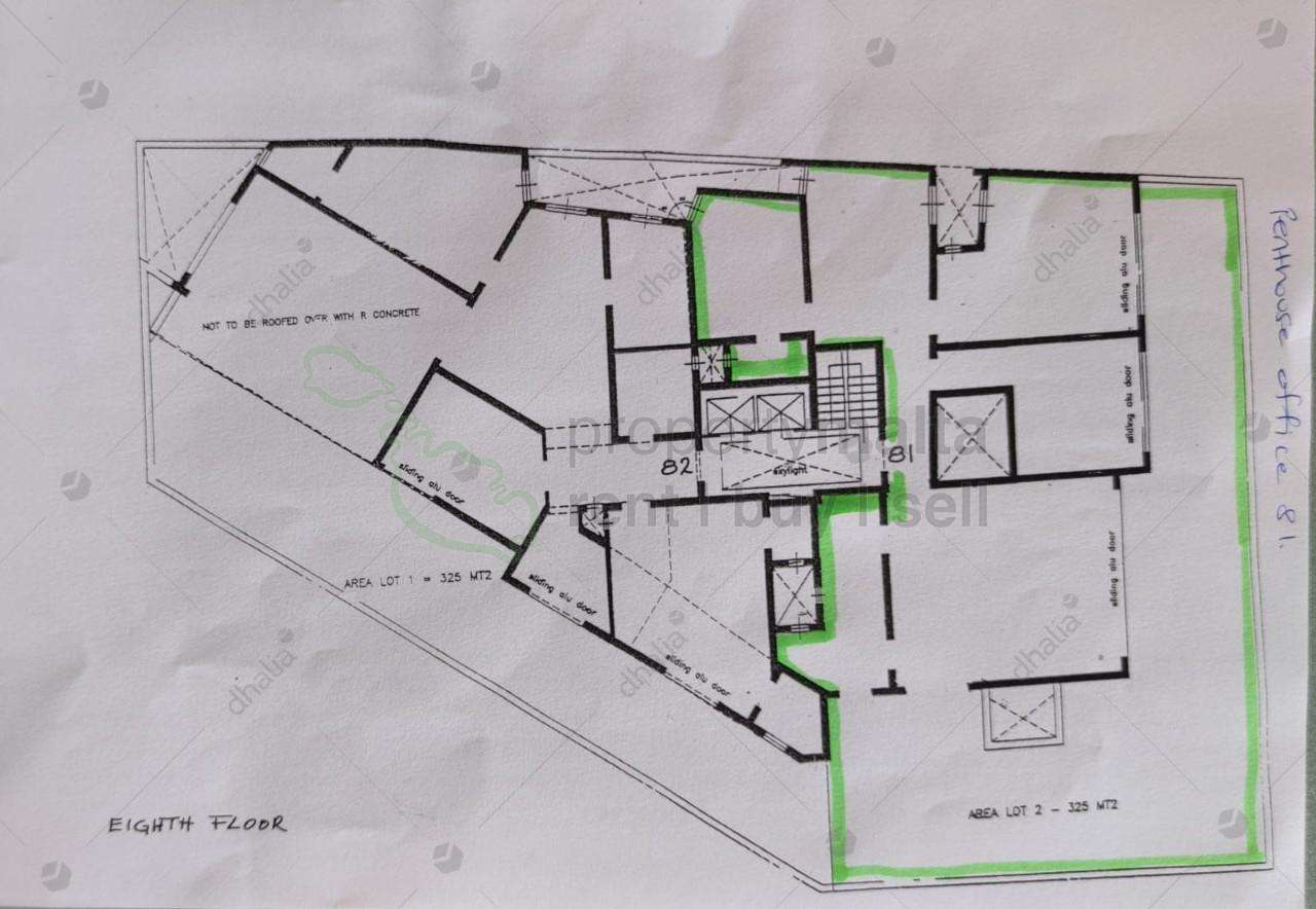Penthouse office with a very long L-shaped terrace on the eight-floor with a total area of 325 square metres of which 182 square metres are internal. Office forms part of a luxury commercial centre right in the heart of Sliema`s shopping area.