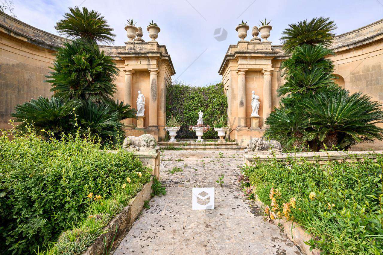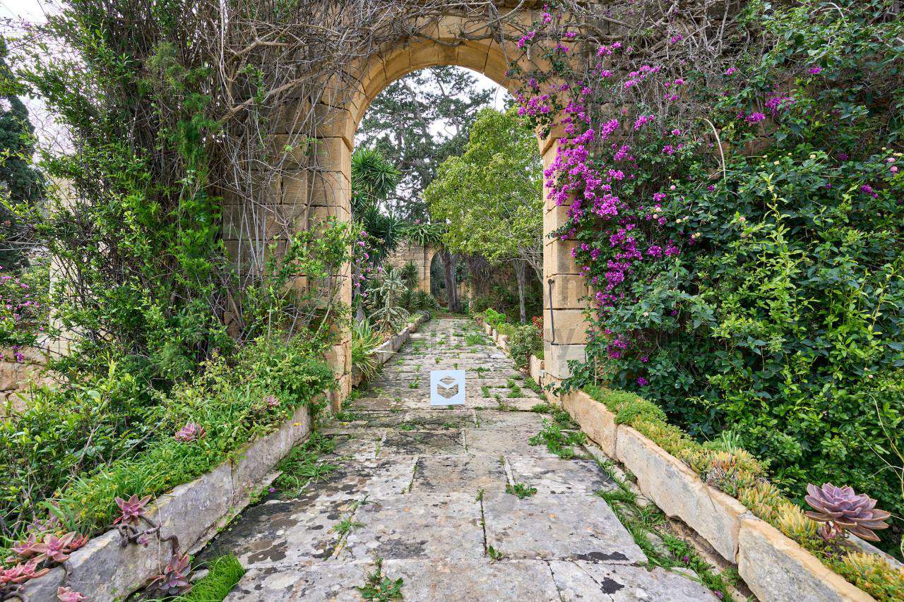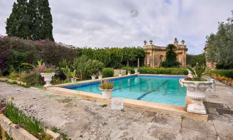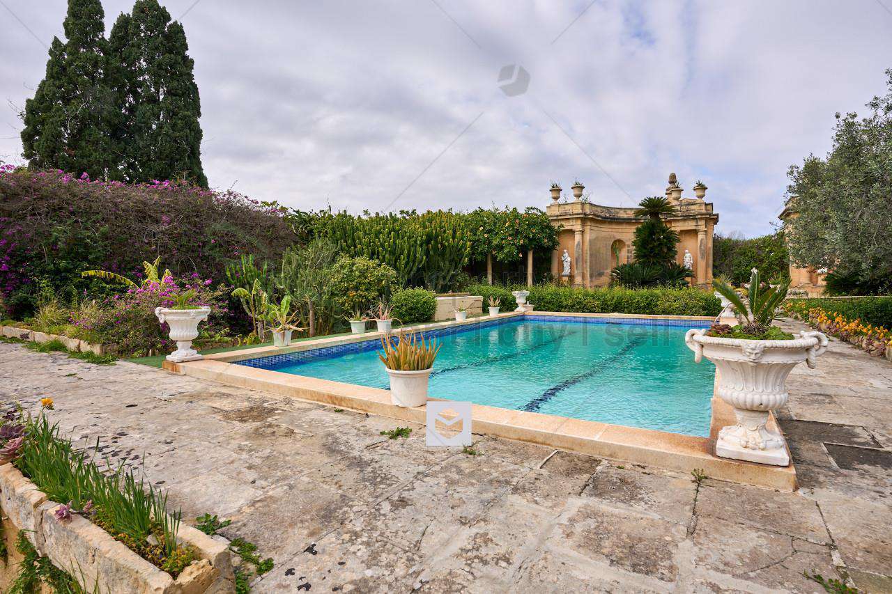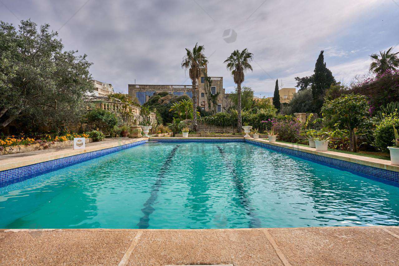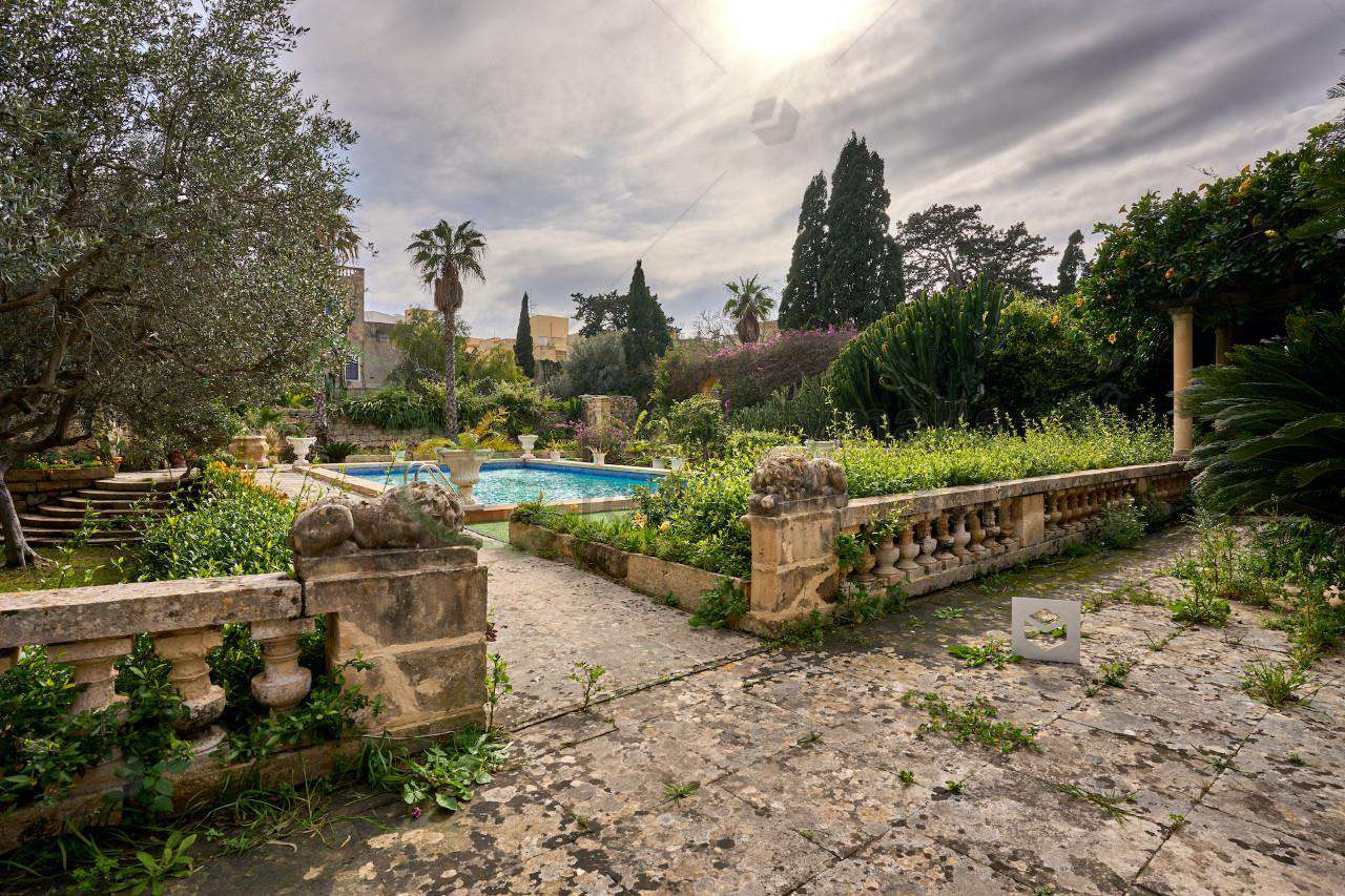 Unique triple-fronted corner Palazzo set on 3700 square metres in old village surroundings. The grand entrance to this palazzo is wide, then one finds a large double living/sitting room on the right-hand side and a separate dining room on the left. Behind are traditional maid`s quarters, kitchen/dining, and a wide staircase to the upper floor distinctly having four to five bedrooms, bathroom facilities, terraces and a most original living room dressed up with pristine stained glass apertures leading onto a large terrace overlooking the whole estate. The most beautiful part of this home is the mature gardens all dressed up with ponds, wells,a swimming pool, orange and lemon grows, palm trees,a state-of-the-art carob tree surrounded by the most impressive Belvedere and fortified walls. Truly giving a feeling of history and nobility the aura the property offers lies in its pristine and untouched splendor. There also is a large annex area and garage suitable for four cars easily accessible by car.