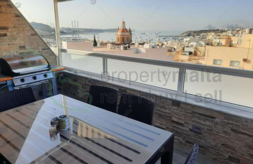 Nicely furnished two-bedroom airconditioned penthouse in Bugibba. The property consists of a kitchen/living/dining area leading onto a good-sized sunny terrace enjoying sea views and a bathroom.