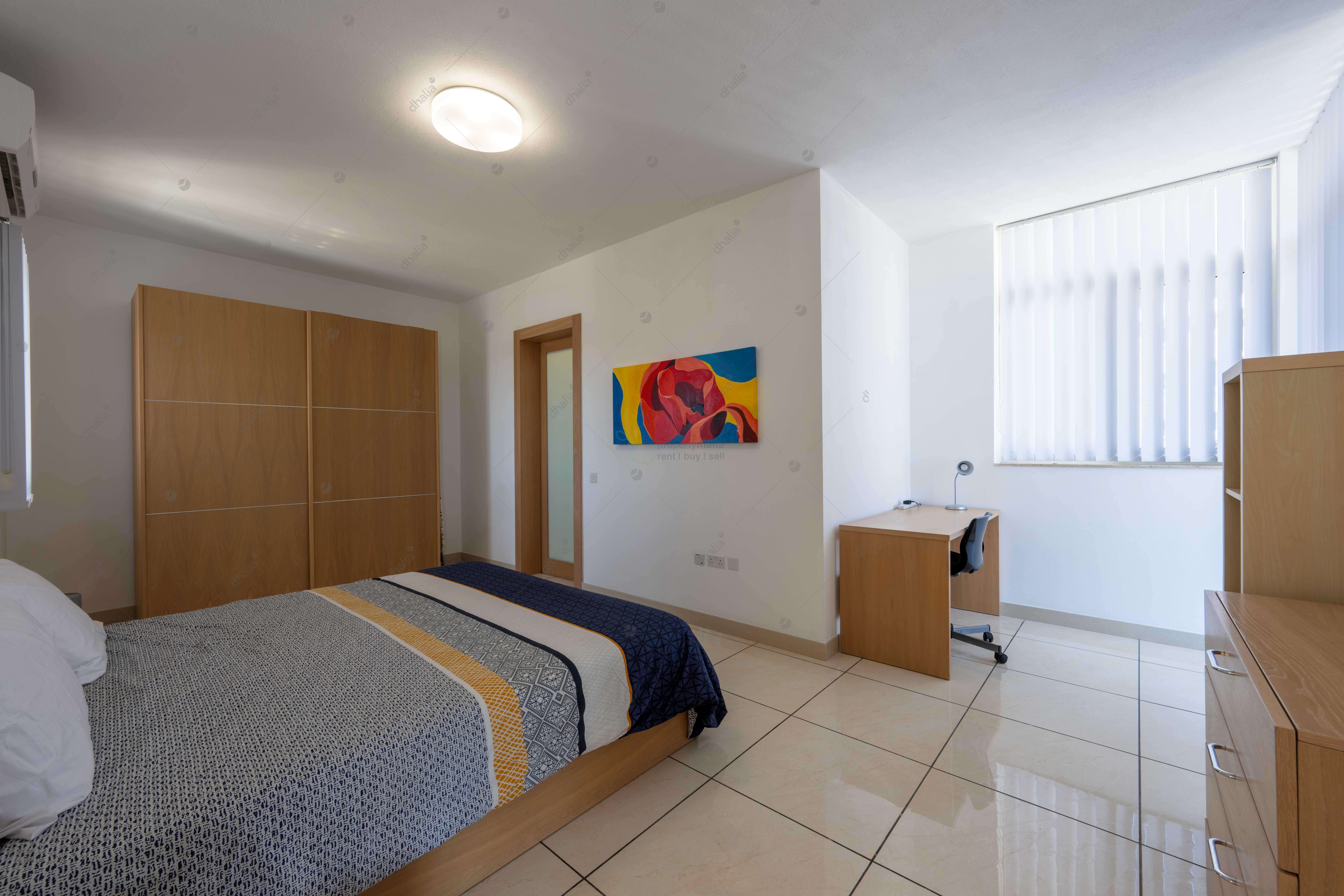 This brightly lit property is located on the 6th floor, having an internal area of 120 square metres and an impressive encapsulating terrace measuring 140 square metres. The property comprises an open kitchen/living/dining area, a main bathroom, a main bedroom (complete with an ensuite), and a double bedroom. The terrace comprises an outdoor dining space, having distant views of Valletta, making it ideal for entertaining. An optional underlying car space is also available at an additional €60 per month.