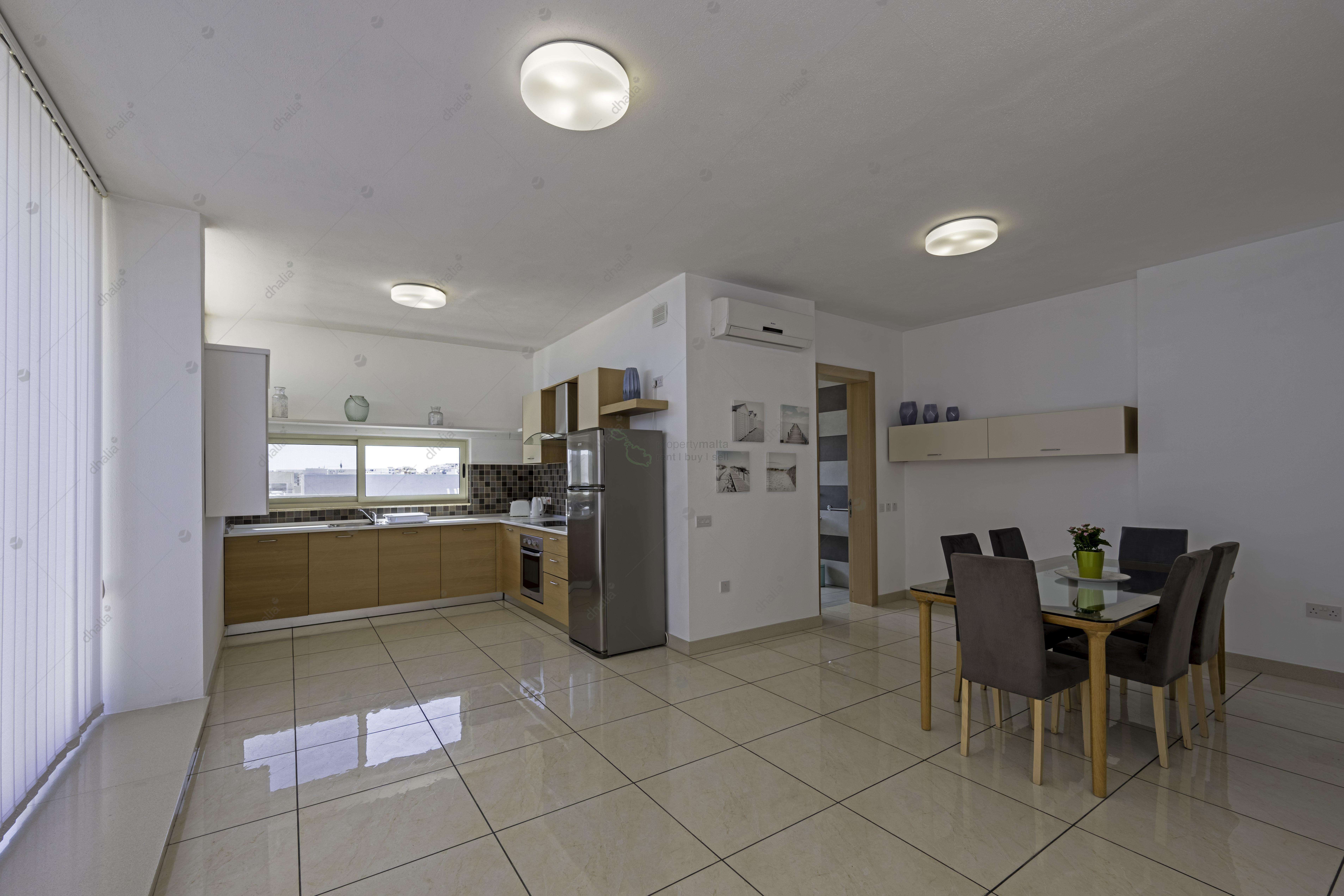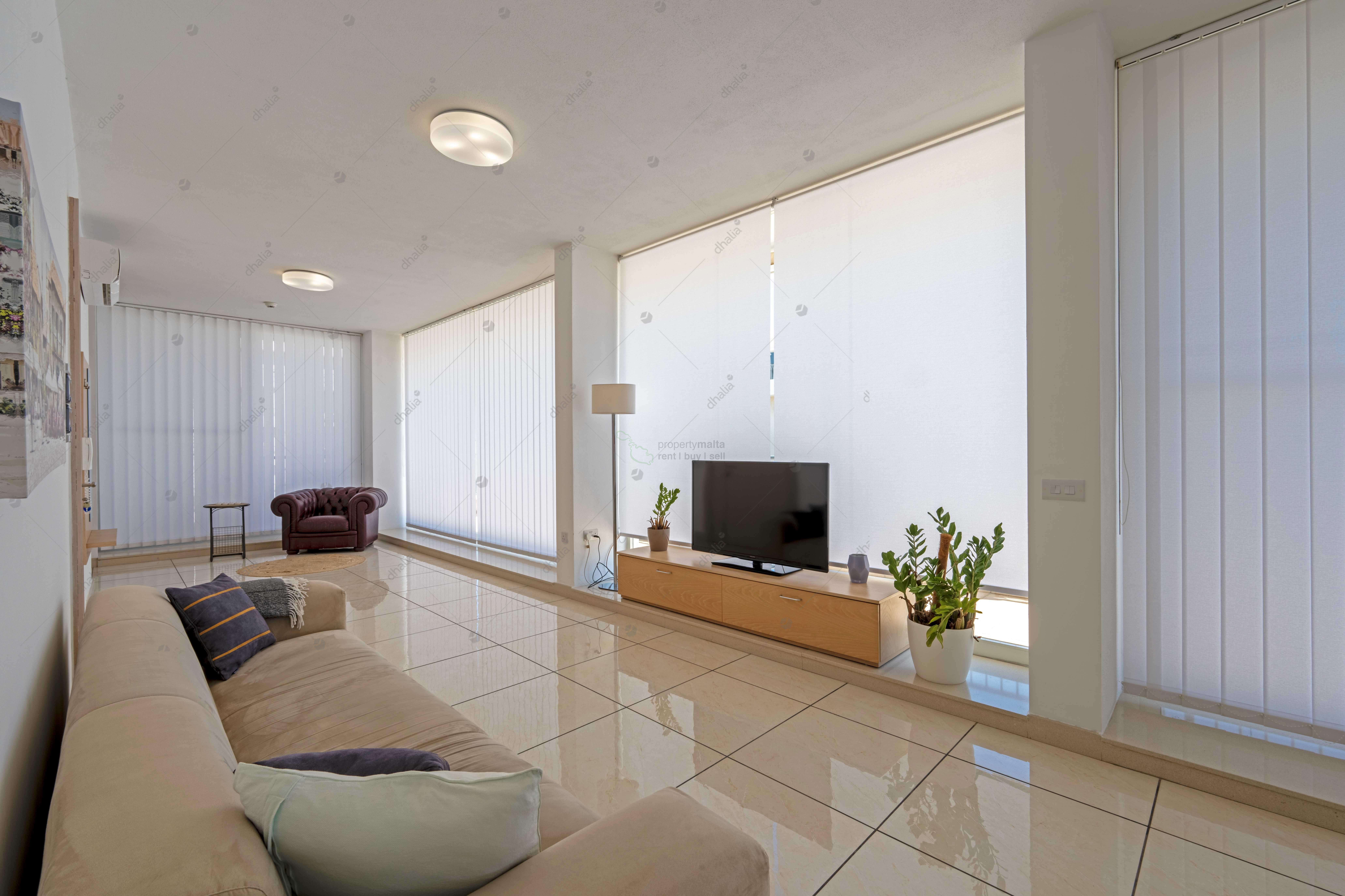 This brightly lit property is located on the 6th floor, having an internal area of 120 square metres and an impressive encapsulating terrace measuring 140 square metres. The property comprises an open kitchen/living/dining area, a main bathroom, a main bedroom (complete with an ensuite), and a double bedroom. The terrace comprises an outdoor dining space, having distant views of Valletta, making it ideal for entertaining. An optional underlying car space is also available at an additional €60 per month.