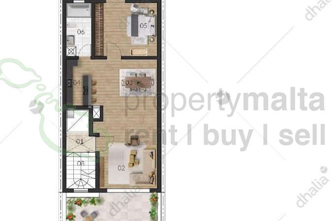 A one-bedroom penthouse measuring approximately 96 square metres. The layout comprises an open plan kitchen/living/dining leading to a front terrace, a main bathroom, and a master bedroom leading to a spacious back terrace. Freehold.