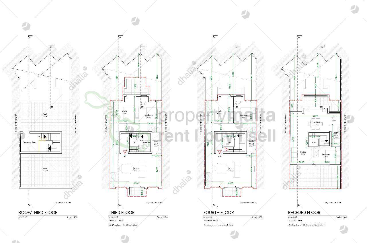 A new fifth-floor penthouse in Msida, close to the University of Malta, is served with a lift from the ground floor. The penthouse consists of a bedroom, bathroom, living room, leading to a front terrace and a kitchen/dining room leading to a back terrace and selling semi-finished, excluding bathrooms and internal doors. Freehold.