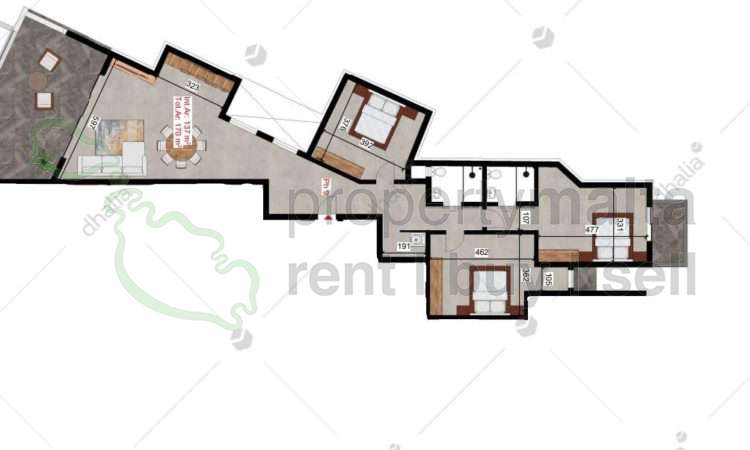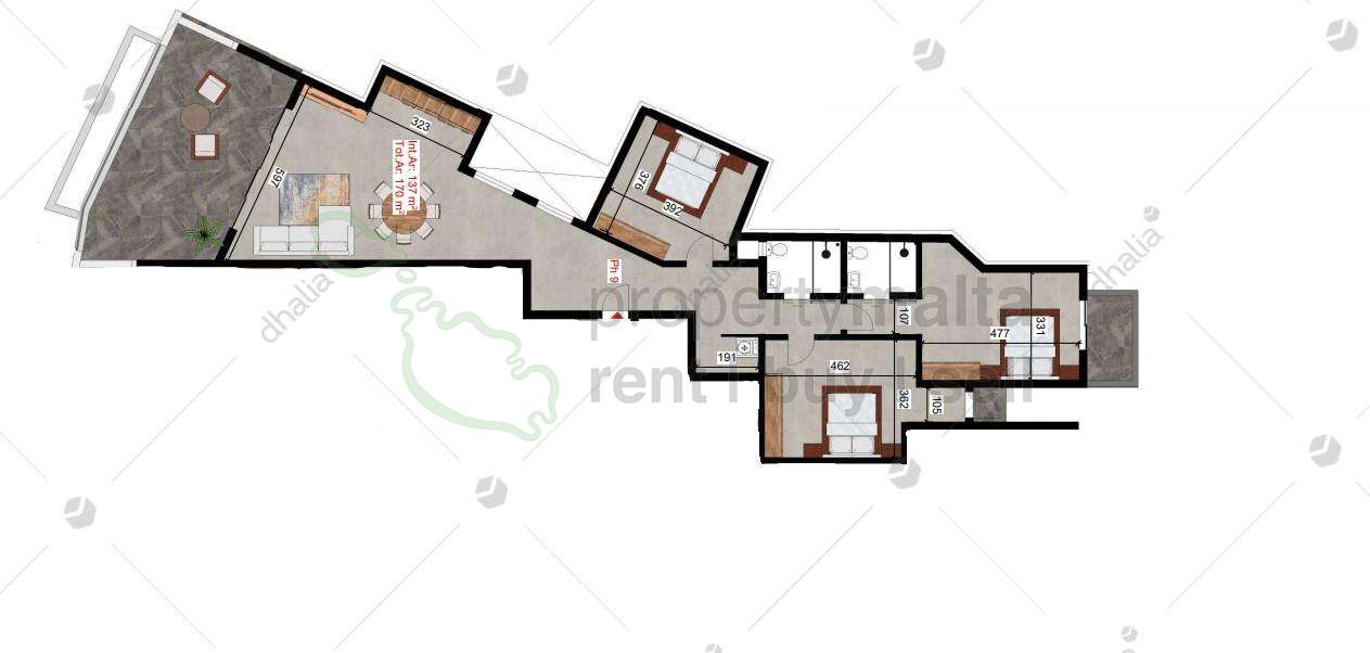 An opportunity to purchase a three bedroom penthouse, overlooking a peaceful green area with stunning countryside views. The layout features an open-plan kitchen, living, and dining area, leading to a spacious front terrace, a main bathroom, and three double bedrooms (main with an en suite and a back balcony). Optional garages are also available. The property is being sold finished, excluding doors and bathrooms.