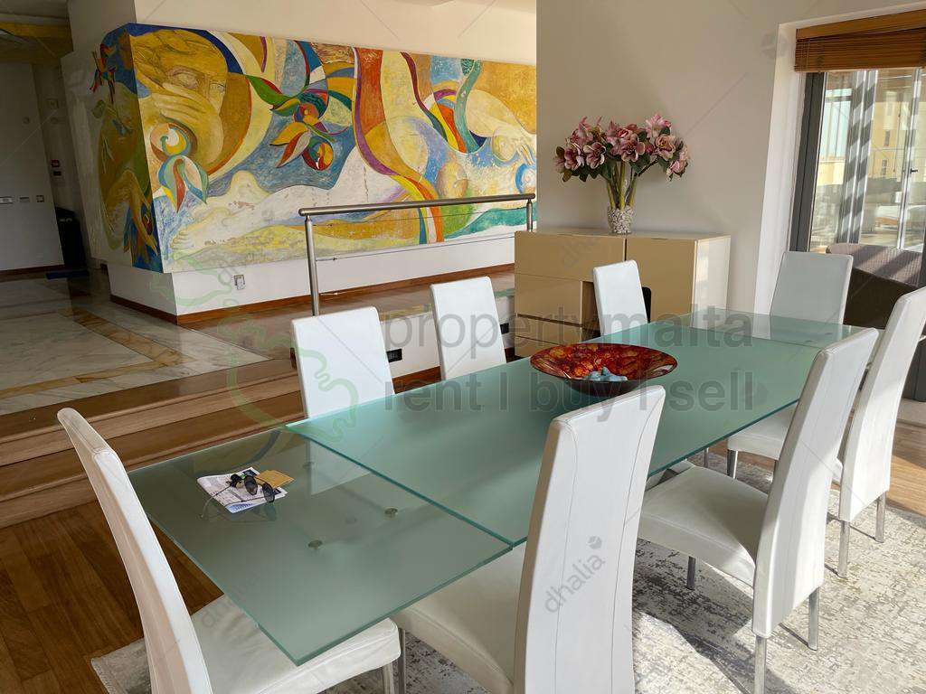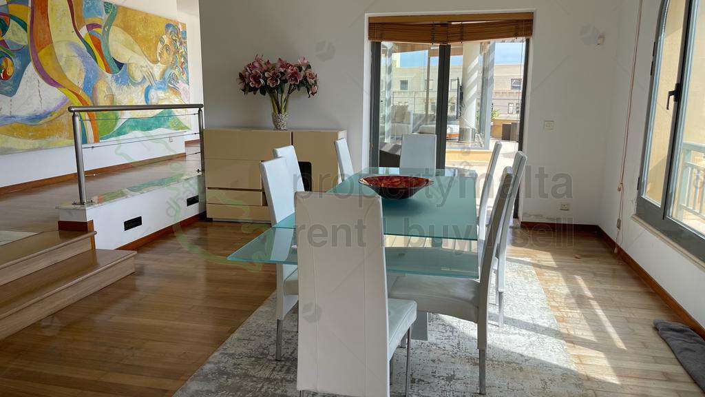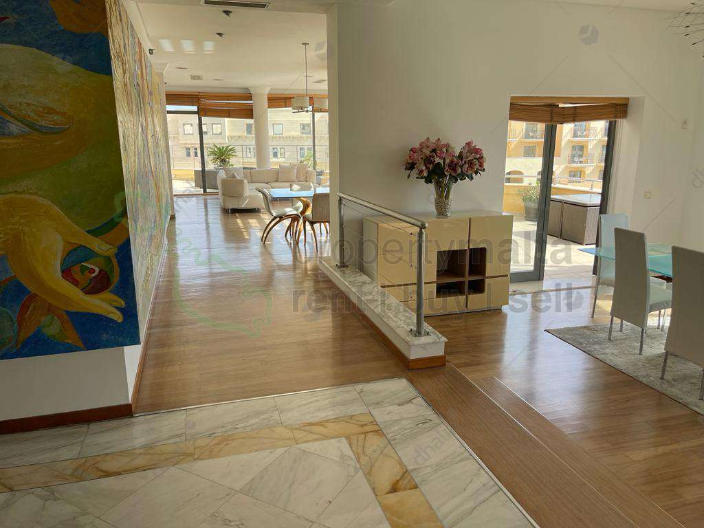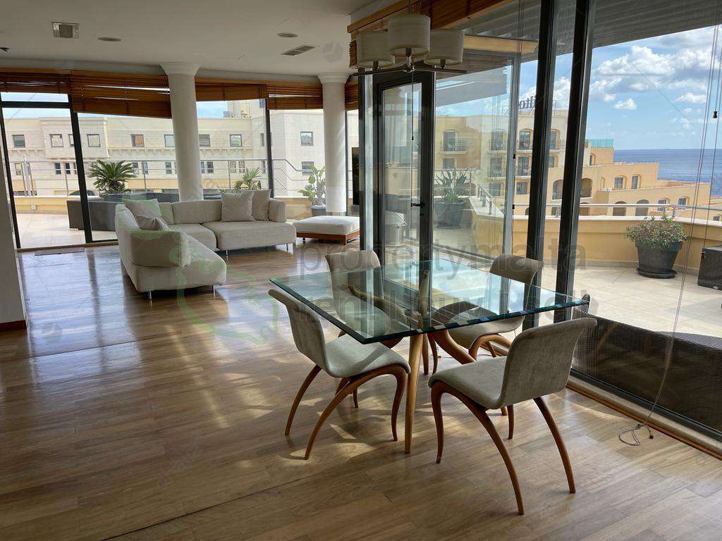 A designer finished penthouse, forming part of Portomaso Complex, enjoying magnificent views of the Marina of the open sea and of the Sliema coast. Layout comprises an entrance hall, a fitted kitchen/breakfast, living room, lounge/dining, guest toilet, utility room, three double bedrooms (all having bathroom and shower en suite), a good sized terrace having a Jacuzzi and a sauna. A car space is included.