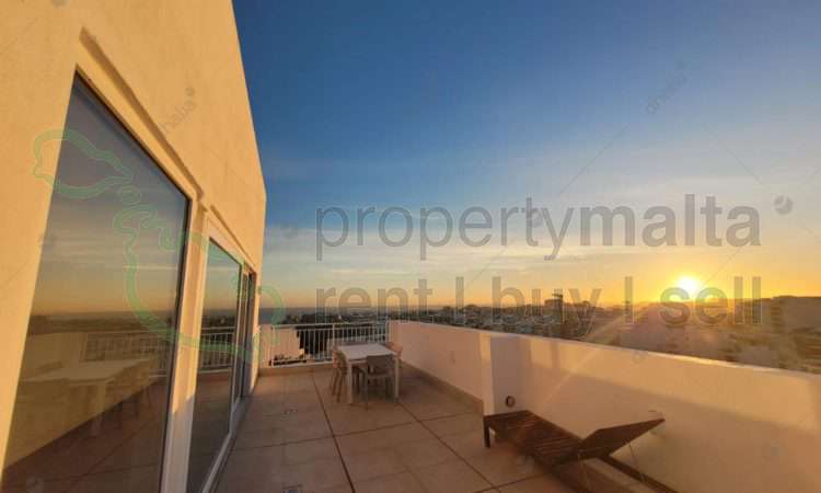 Highly finished and furnished fifth-floor penthouse located in the quiet residential area of Ta`Giorni in St Julians. The property is flooded with natural light with a layout comprising two bedrooms (one with an ensuite shower), a guest bathroom with shower, a large open plan kitchen/living/dining area and back and front terraces enjoying panoramic views of the sea and the surrounding areas.
