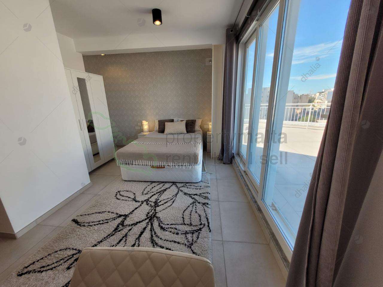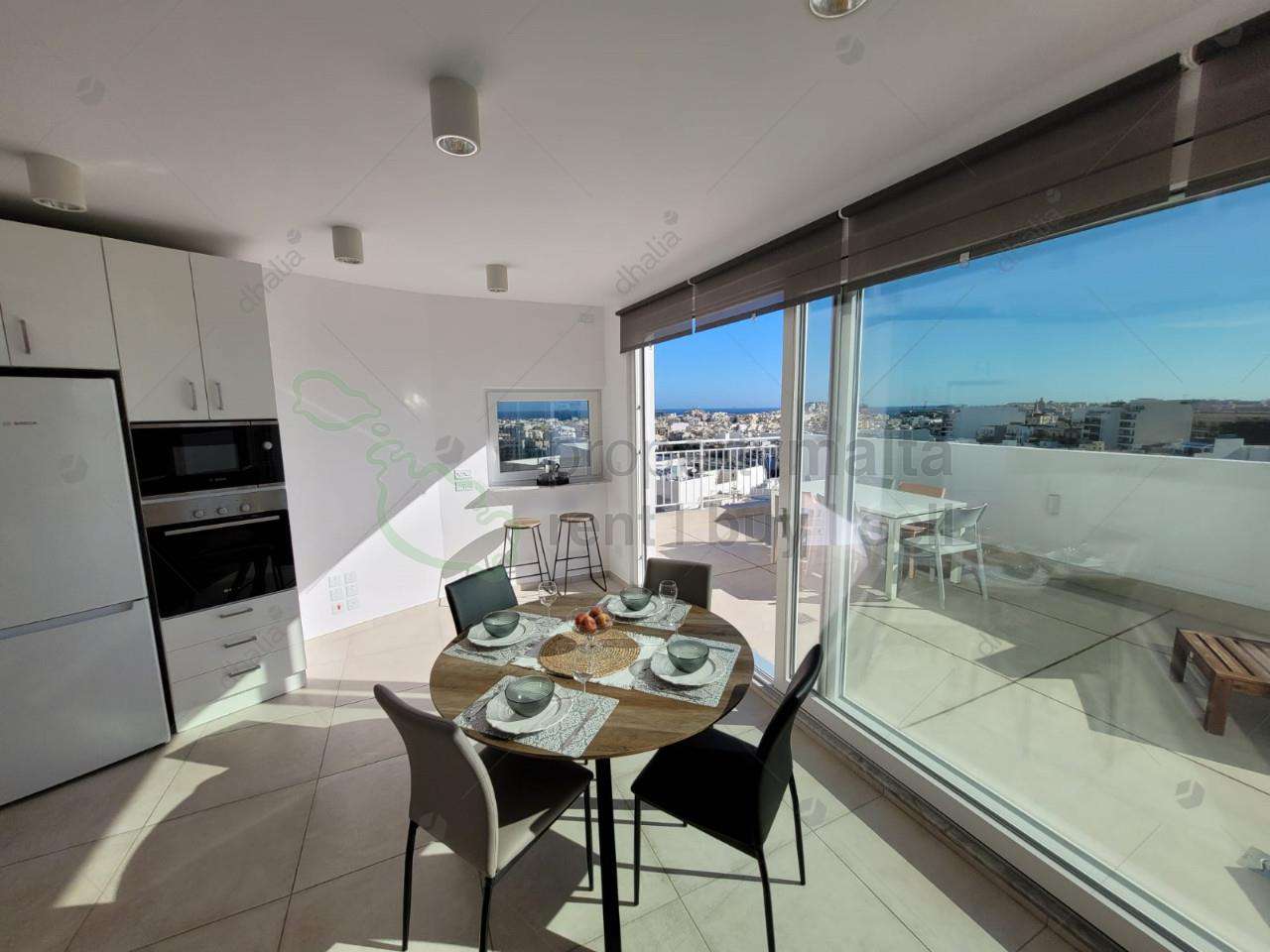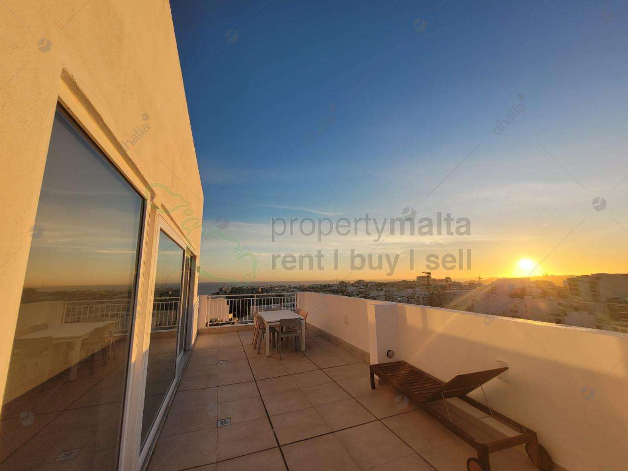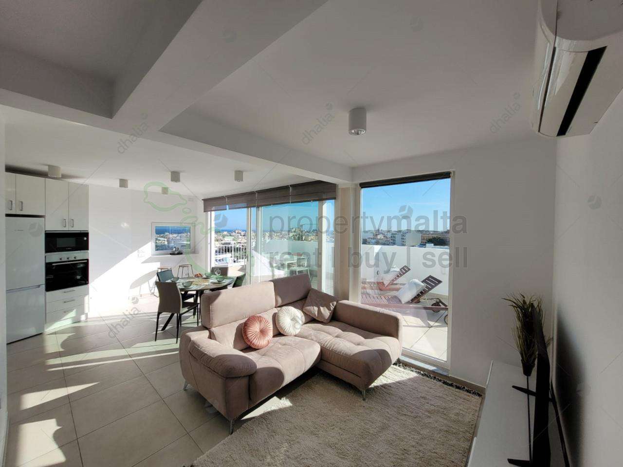 Highly finished and furnished fifth-floor penthouse located in the quiet residential area of Ta`Giorni in St Julians. The property is flooded with natural light with a layout comprising two bedrooms (one with an ensuite shower), a guest bathroom with shower, a large open plan kitchen/living/dining area and back and front terraces enjoying panoramic views of the sea and the surrounding areas.