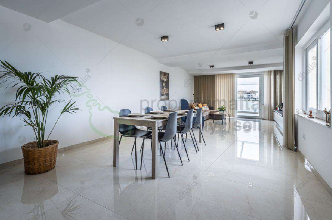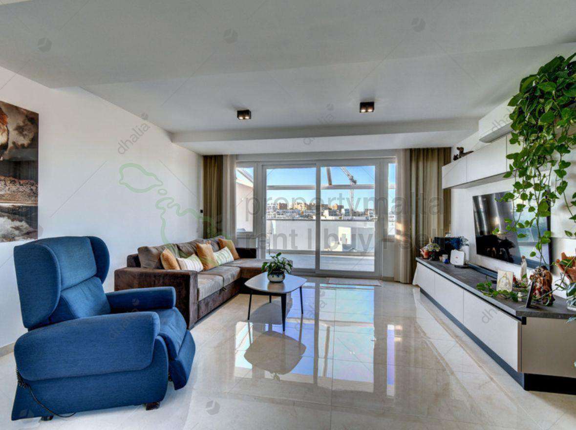 Lovely Penthouse having distant sea & Valletta views. Set on a quiet street in the upper part of St. Julians. This exceptional two-bedroom, two-bathroom penthouse forms part of a modern smart block built just three years ago, ensuring privacy and tranquillity. The penthouse offers a generous 140 square metres of internal living space, finished to high standards and fully equipped and furnished, ready for immediate occupation. The layout is bright and spacious, complemented by 40 square metres of balconies that capture stunning sea and Valletta views, perfect for indoor-outdoor living. A major highlight is the expansive 130 square metres of private roof , enjoying full airspace ownership, ideal for entertaining. Price further includes two car spaces.