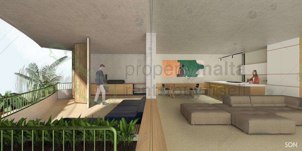 This wide-fronted and highly finished penthouse with a total area of 185 square metres has just been built to very high specifications. The layout consists of an open plan, kitchen/living/dining area leading onto a large 50-square-metre terrace ideal for entertaining. Further in one finds two double bedrooms (main with an en-suite), both leading to a back balcony and the main bathroom. To add to this, the developer has also prepared the ideal recreational area on the 60 square metre roof terrace with BBQ and sunbathing area where one can entertain whilst admiring beautiful views. Being sold finished, excluding bathrooms and doors. Optional one-car garages are available. Freehold.