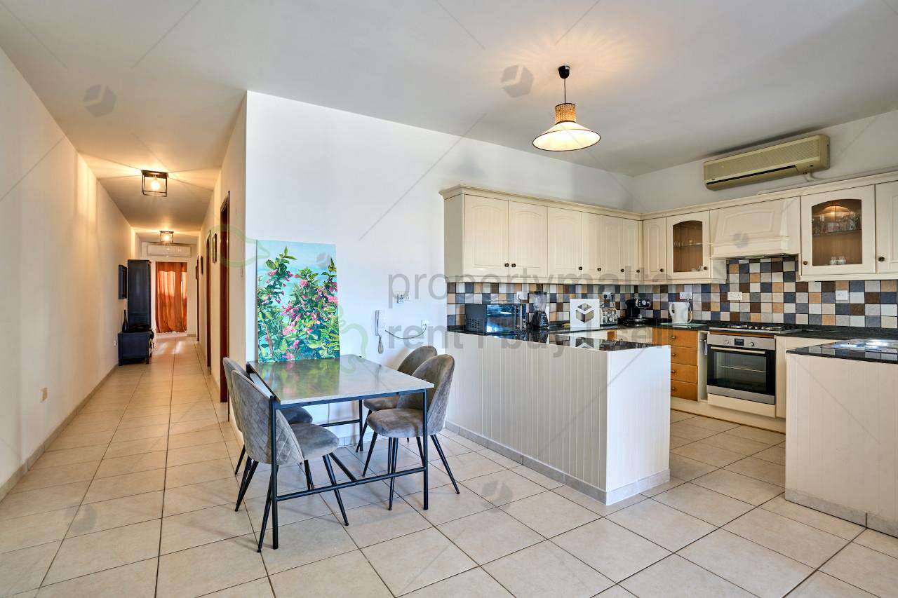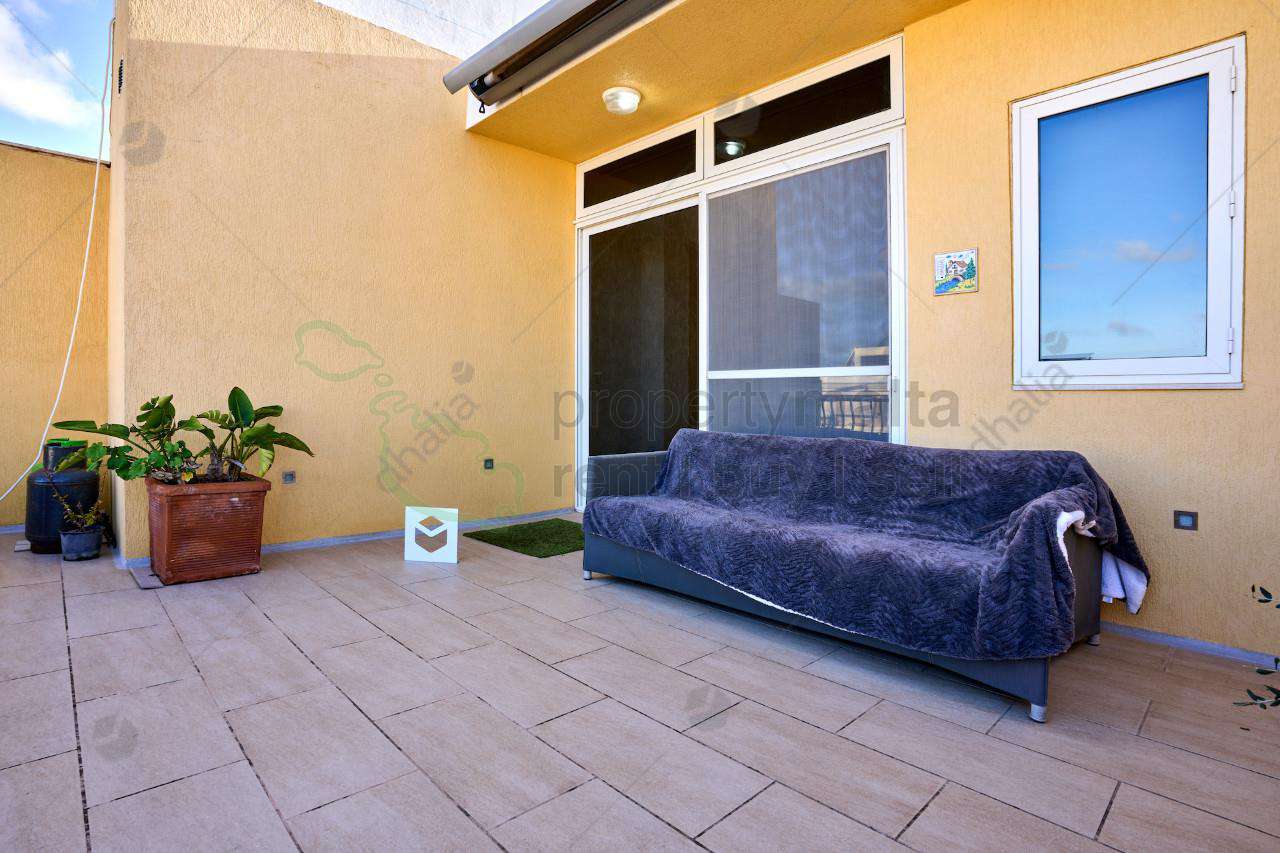 Penthouse set on the 4th floor located in a quiet residential area close to all amenities. The property consists of an entrance into an open plan kitchen/ living/ dining area leading to a lovely terrace enjoying distant sea views. Two double bedrooms, main with en suite, main bathroom, a study room and a back terrace. The property comes fully equipped with AC units, solar panels, a dishwasher, a washing machine, a dryer, etc.