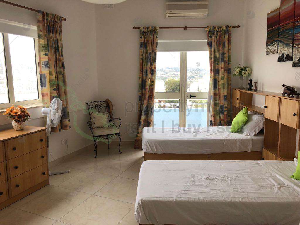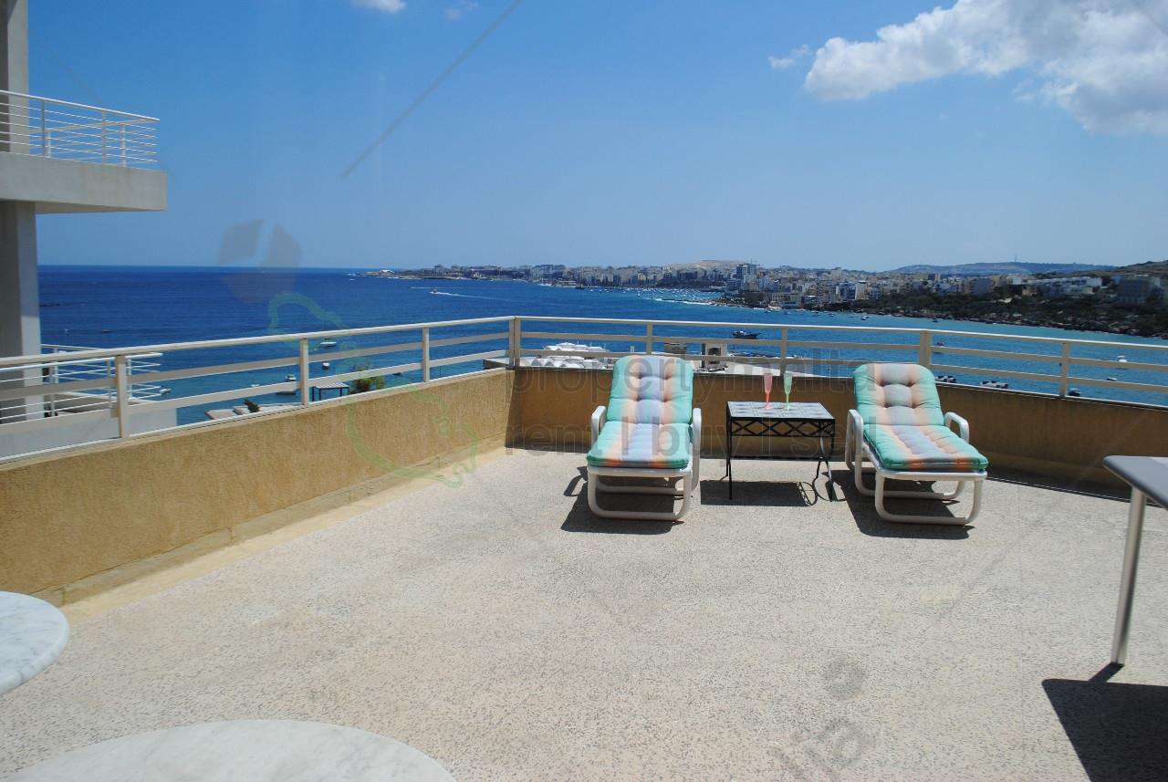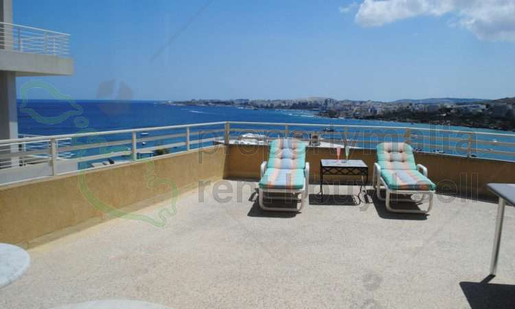 One-of-a-kind Penthouse, set in the much sought-after Xemxija Hill, seaward side. It enjoys spectacular, panoramic sea views of St. Paul`s Bay from all rooms and a huge 40 square metres terrace. The layout includes a spacious living/dining room, kitchen, three good-sized double bedrooms, two bathrooms, and two inbuilt storage cupboards. The living/dining and the main bedroom open onto the main veranda. The second bedroom has a separate balcony. All rooms feature unobstructed panoramic sea and country views, A/C units, and double-glazed windows. This unique property is complemented by its own air space, the use of a common pool and pool area with shower rooms, and an off-road garage space. Served with lift.