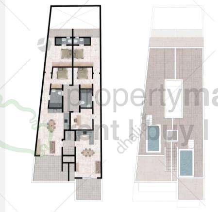 A ready-built two-bedroom and study penthouse with sea views. The layout comprises an open plan kitchen/living/dining leading to the front terrace enjoying the serene sea views, a main bathroom, a master bedroom with ensuite facilities, a second double bedroom, a study which can be used as a third bedroom, and a pool area at roof level. Optional garages and car spaces available. Being sold finished, including bathrooms, excluding doors.